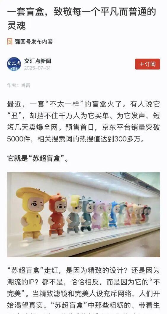 从新华日报交汇点新闻官方宣传可以看到,苏超官方盲盒这次反颜值的设计,没有采用千篇一律的萌脸,只不过是呈现了万千普通人平凡的面孔,没有采用太多花哨的设计,也不是简单的“丑”与“美”的二元对立。这张“平凡的脸”背后,是对平凡的致敬,也是对非凡的纪念。这不是一场属于明星球员的赛事,而是属于万千普通人的盛会,正是一张张平凡的脸,创造着一个个不平凡的瞬间。