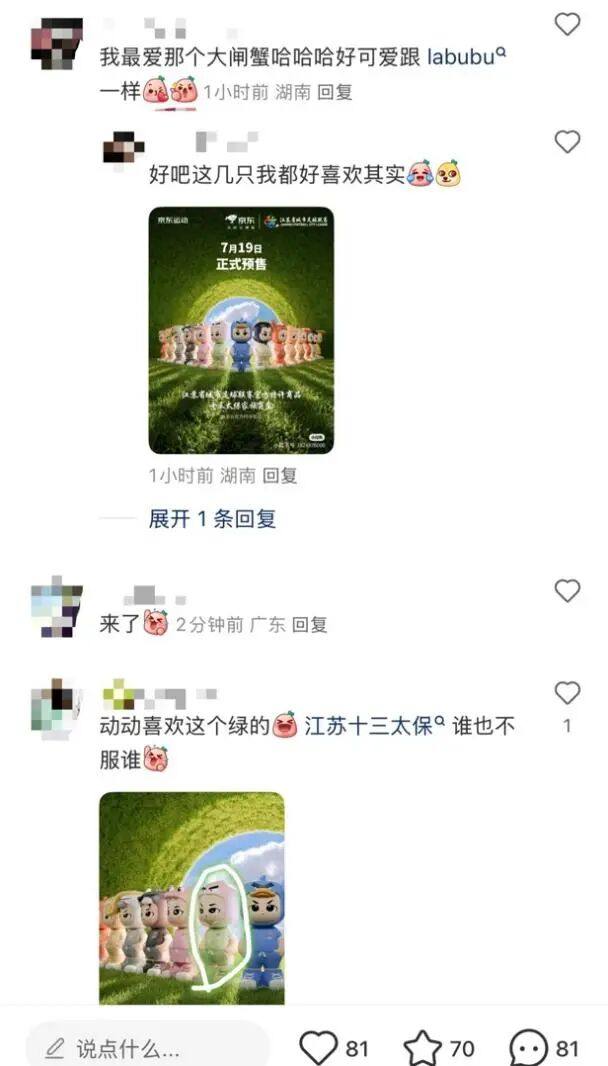反复调研斟酌后,“十三太保”盲盒选择以赛事热点为开发理念,“我们会从评论、话题里去抽取热梗,作为我们基础的要素,例如把每个城市的梗做到面部表情上”,但在具体形象上,也融合了当地特色,例如将盐城麋鹿、无锡水蜜桃等元素,增加城市识别度。