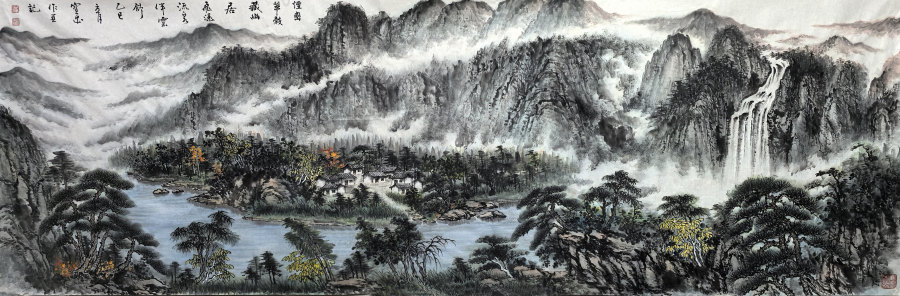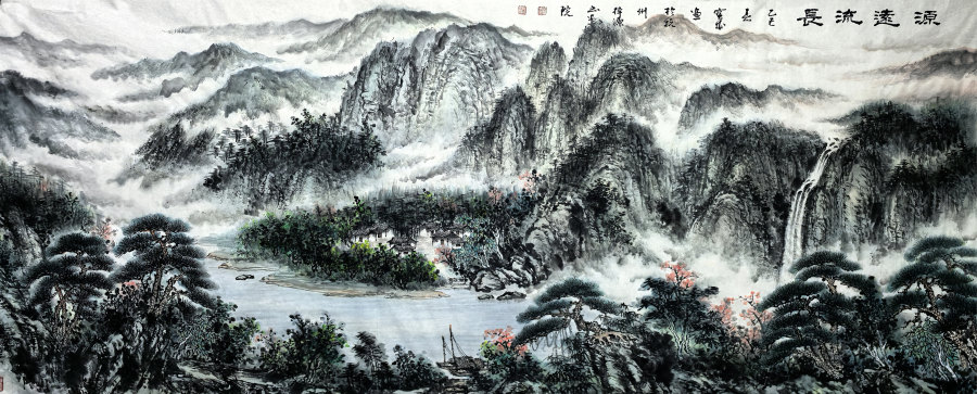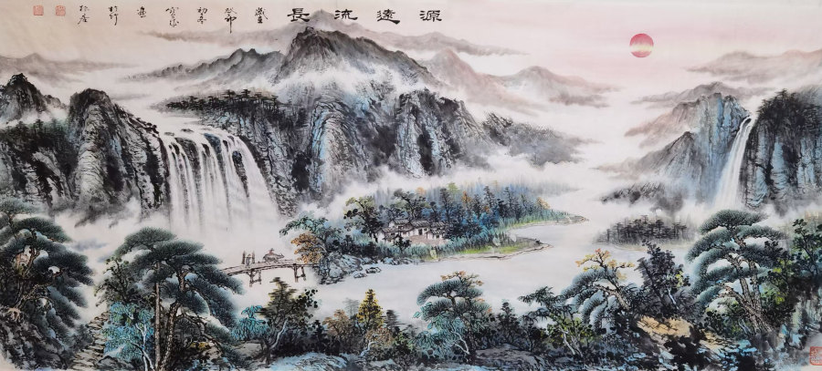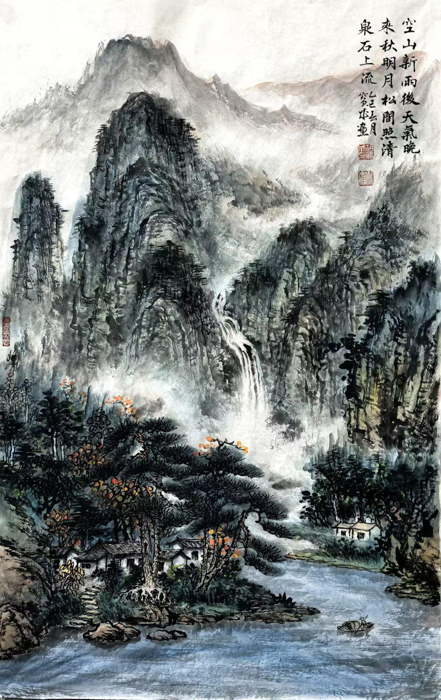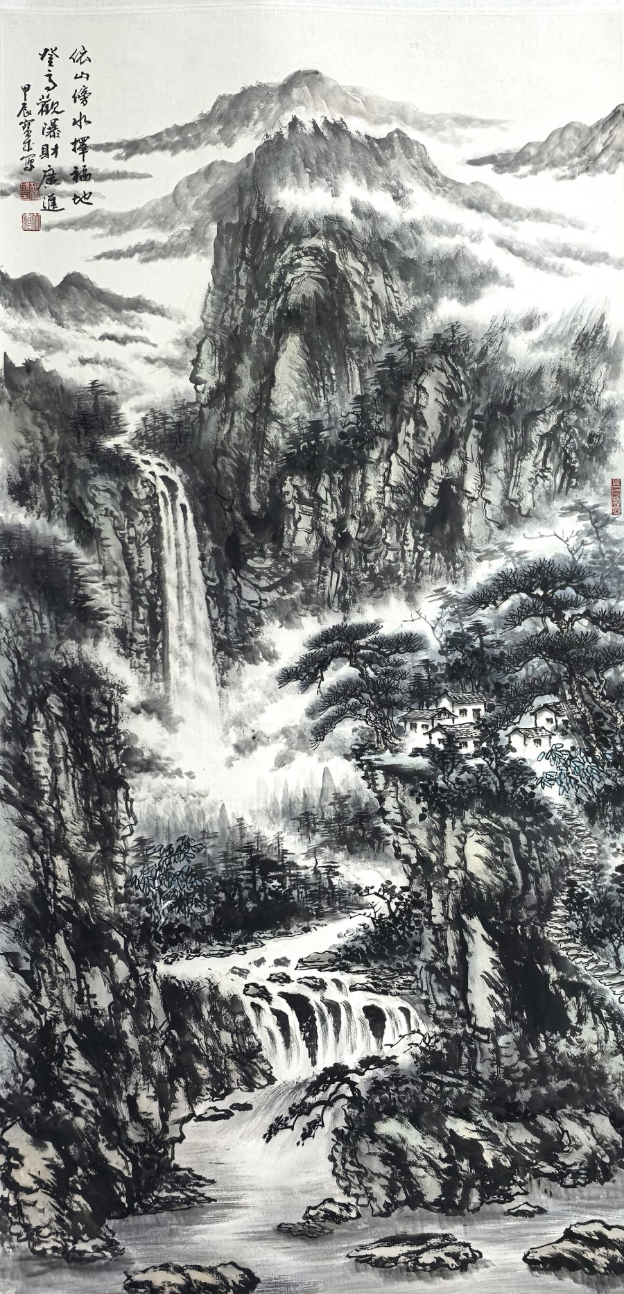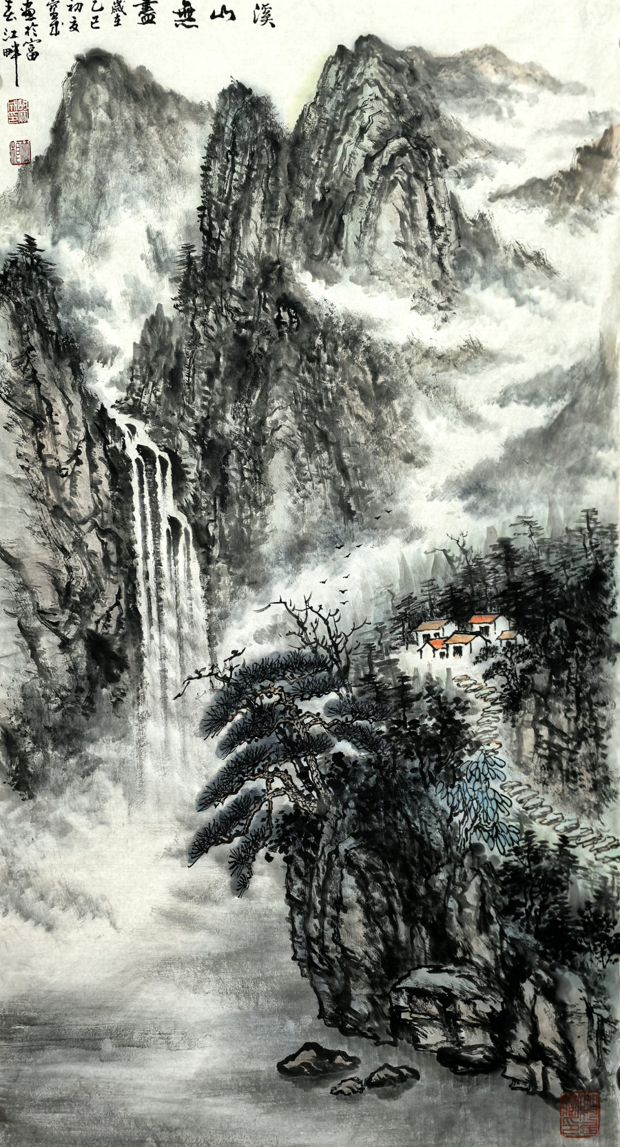 在技术层面,他融合了北派山水的雄强与南宗水墨的温润,并吸收了西方绘画的光影与透视技巧,但始终以笔墨为中心,强化线条的书写性与墨色的层次感。在思想层面,他的作品常隐含人文关怀,如古村系列中对传统聚落的描绘,不仅是对建筑景观的记录,更是对农耕文明与乡土情感的回望与挽留。