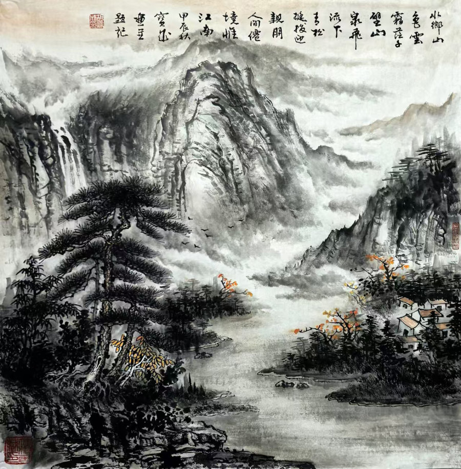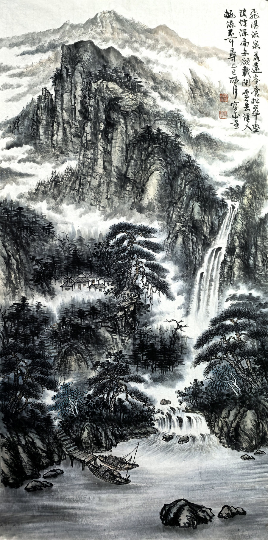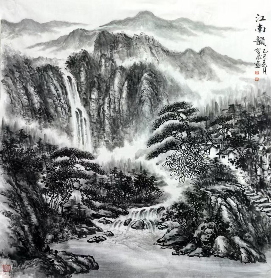 在中国画史上,“写实”与“写意”常被置于对立面,但胡宝成试图打通二者的界限。他的山水画,如入选全国展览的《嵩溪古村》《舞龙峡飞瀑》,既注重物象的准确刻画——古村的砖瓦纹理、瀑布的水势动感皆栩栩如生,又通过虚实相生的构图与水墨氤氲的渲染,营造出超脱于物外的意境空间。他笔下的山水并非客观自然的简单复制,而是融入了人文记忆与情感投射的“心象风景”。例如《江南韵》作品中,朦胧的远山、轻舟、屋舍与烟雨,既是对江南景物的真实描绘,也是对“江南文化精神”的意象化表达。