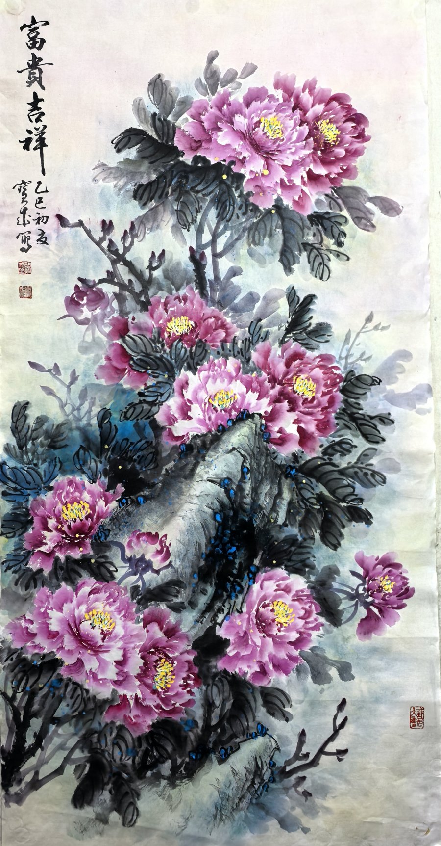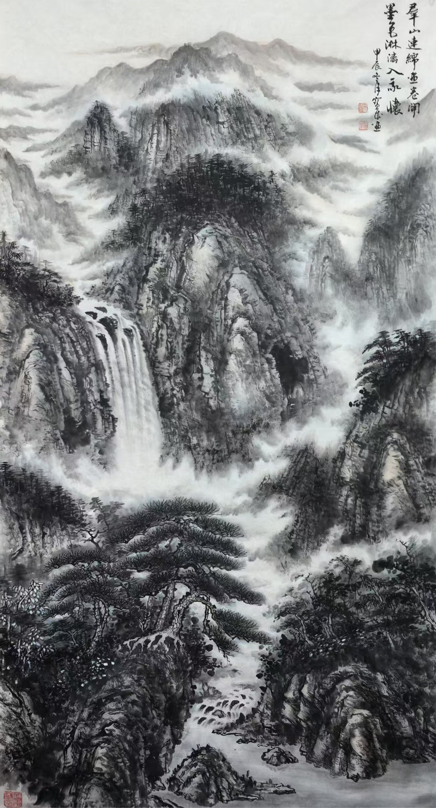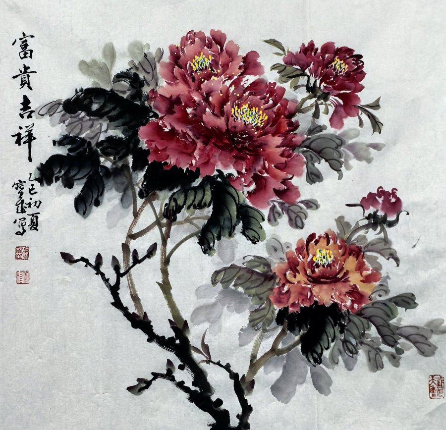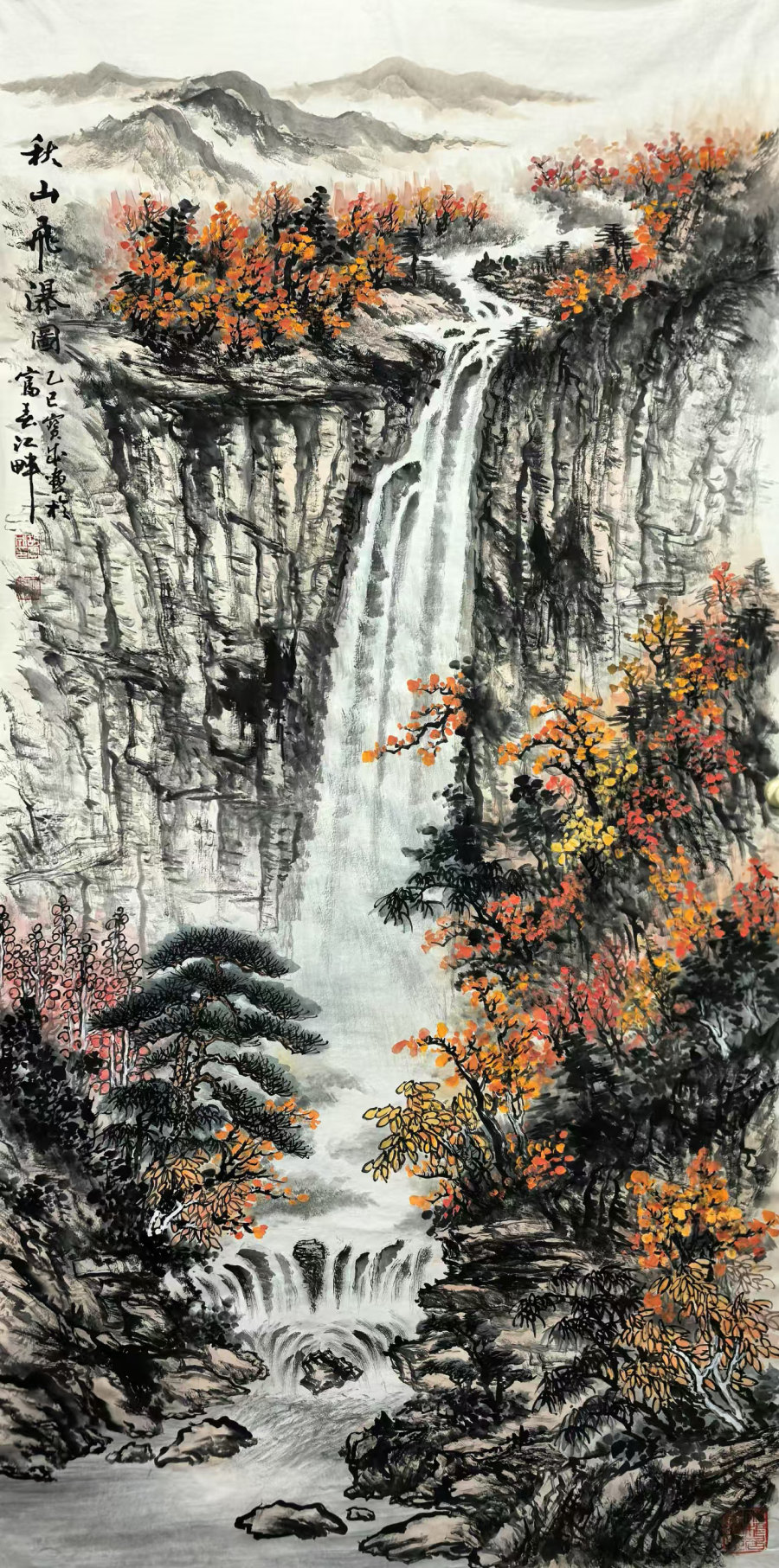 他的山水画以“浑厚中见灵秀”著称,善用积墨法营造山峦的厚重体量,又以淡墨擦染表现云水的空灵,如《秋山飞瀑图》中,巨石嶙峋与飞瀑流动形成张力,整体气势磅礴却细节丰富。他的牡丹作品《富贵吉祥》,则“艳丽中带清雅”,以色彩饱满、笔触奔放展现生命活力,却通过枝叶的墨色调配避免俗艳,透出文人画的含蓄品格。