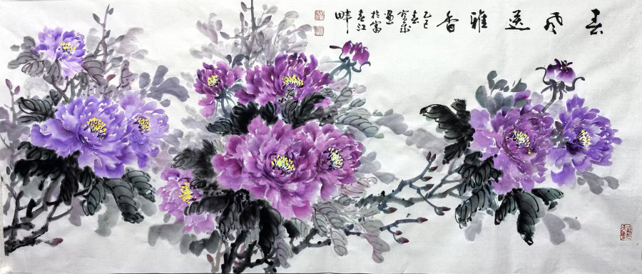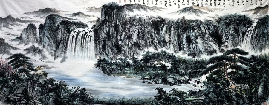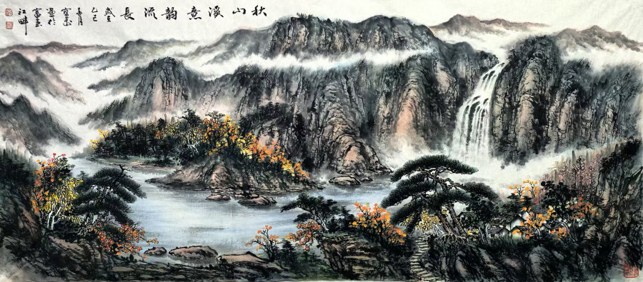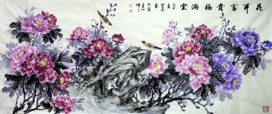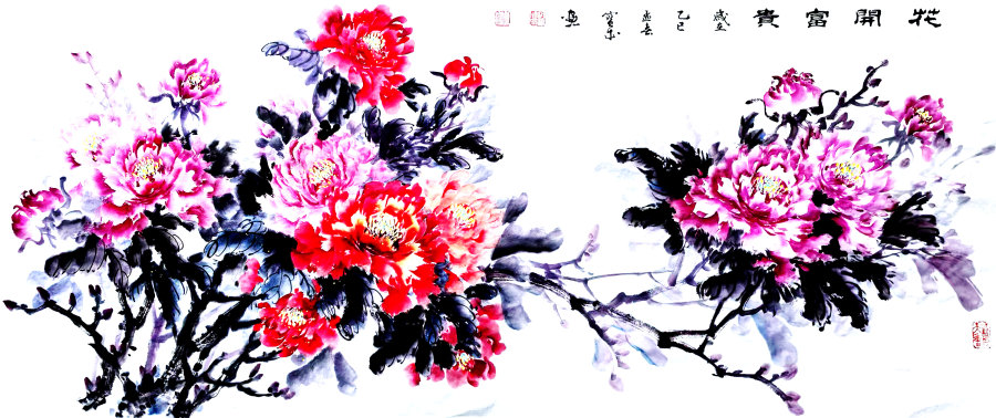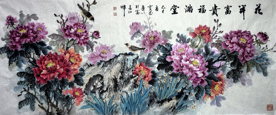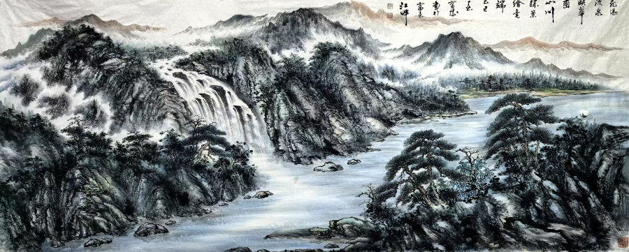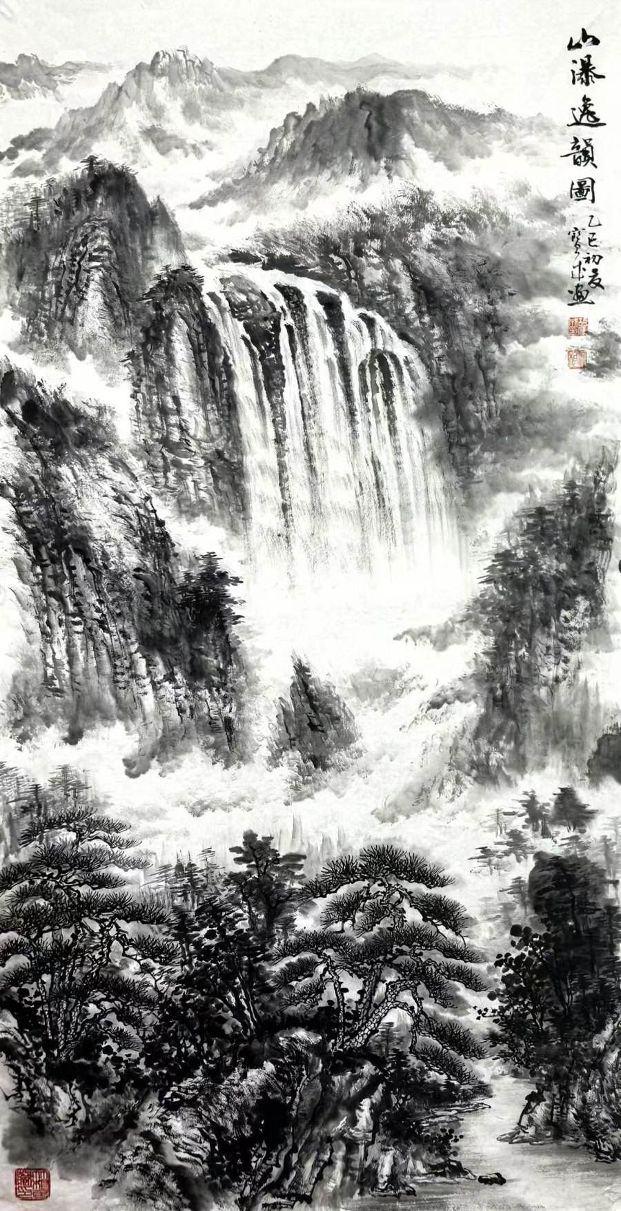 他的山水画以“浑厚中见灵秀”著称,善用积墨法营造山峦的厚重体量,又以淡墨擦染表现云水的空灵,如《秋山飞瀑图》中,巨石嶙峋与飞瀑流动形成张力,整体气势磅礴却细节丰富。他的牡丹作品《富贵吉祥》,则“艳丽中带清雅”,以色彩饱满、笔触奔放展现生命活力,却通过枝叶的墨色调配避免俗艳,透出文人画的含蓄品格。