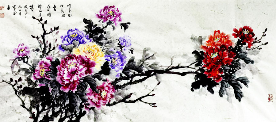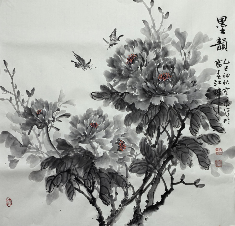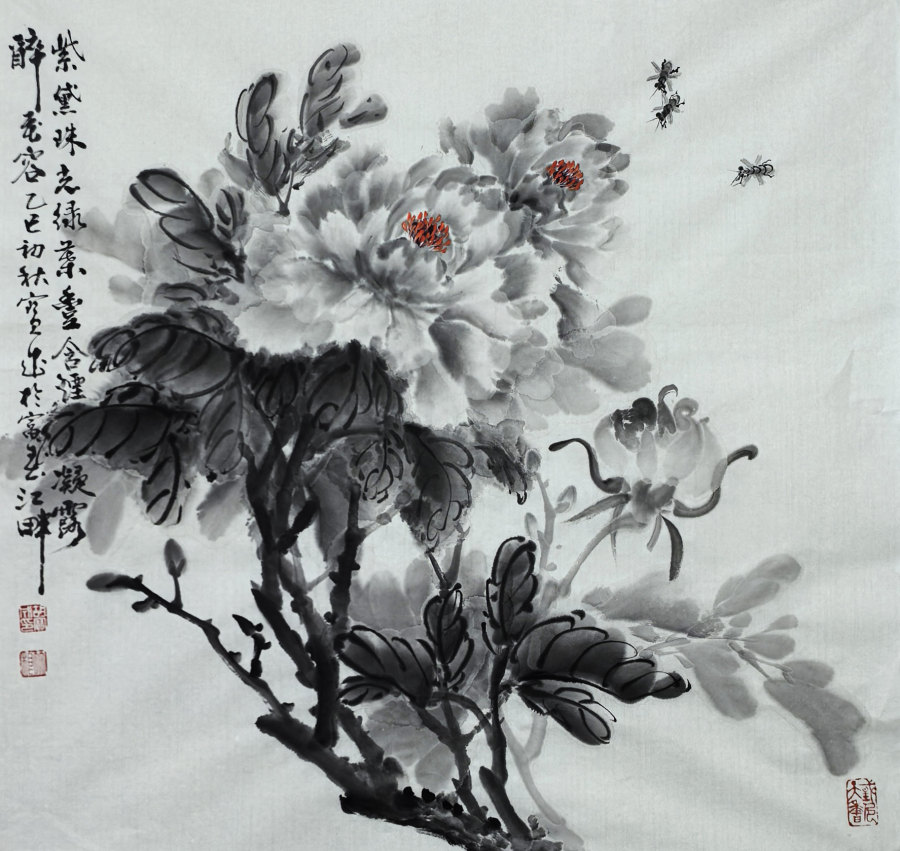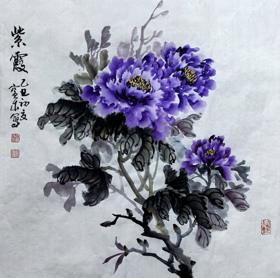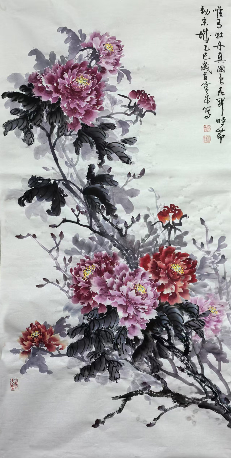 在牡丹创作中,他同样跳脱了传统“富贵牡丹”的俗套,以山水画的笔意融入花鸟画。他常以泼墨、积墨法表现牡丹的丰腴层次,又以工笔细节勾勒花瓣的柔美形态,形成“兼工带写”的风格。牡丹在他笔下不仅是观赏对象,更成为承载生命热情与文化象征的媒介。