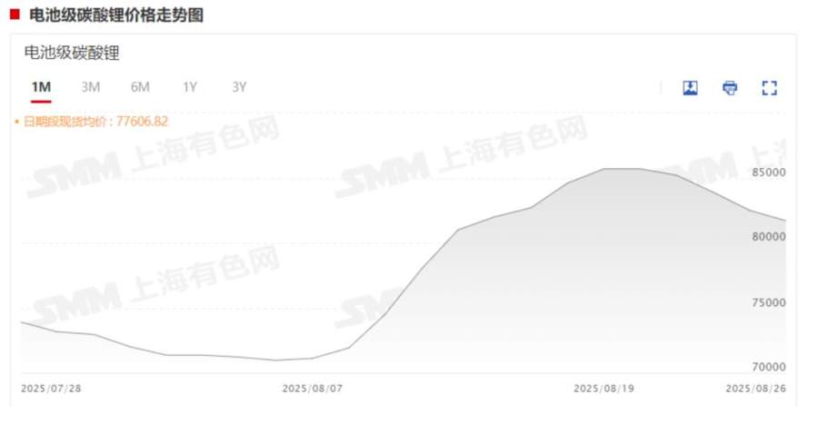 据 SMM 现货报价显示,碳酸锂现货报价在 8 月 19 日最高攀升至 8.57 万元/吨,随后缓慢进入下行通道。截至 8 月 26 日,国产电池级碳酸锂现货报价跌至 7.94-8.4 万元/吨,均价报 8.17 万元/吨,环比涨幅达 13.47% 。