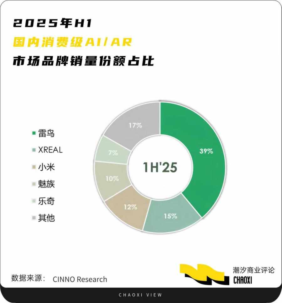 根据CINNO Research国内消费级AI/AR市场报告,2025年上半年,雷鸟创新在AI/AR眼镜销量市场份额高达39%,呈现“断崖式领先”。同年618促销期间,雷鸟全周期市场占有率进一步攀升至52%,销量同比增长3.36倍,包揽京东、天猫XR行业双平台销量冠军。