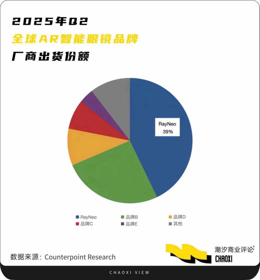 根据Counterpoint 全球XR市场追踪数据显示,2025年第二季度,雷鸟创新以39%的市场份额,首次登上全球第一。