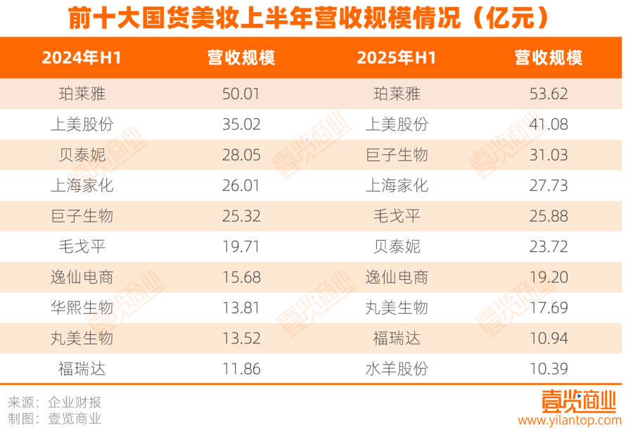 国货美妆半年报披露完毕,珀莱雅以53.62亿元营收稳居第一,上美股份以41.08亿元紧随其后。上海家化、毛戈平、逸仙电商座次稳定,相比去年同期最大的变量,就是巨子生物挤进了前三,贝泰妮跌出前五。