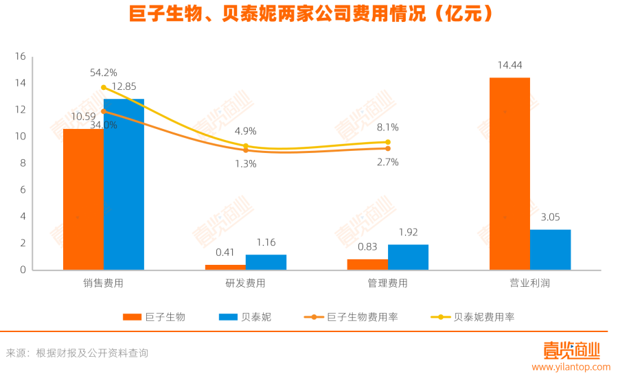 与此同时,巨子生物的费用率远低于贝泰妮。
