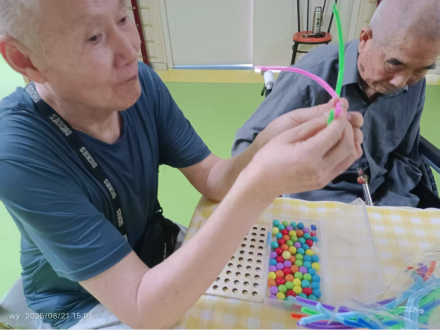 在养老院的日常里,总有温暖与欢乐在悄然流淌,老人们拿起手中的豆豆按照颜色开始摆放,而这个游戏不仅可以锻炼他们的脑力,也锻炼了他们对颜色的认知和手眼协调,让他们手部精细控制动作,期间老人玩的时候也可能存在手部颤抖,但在玩的期间也增强了手部锻炼。