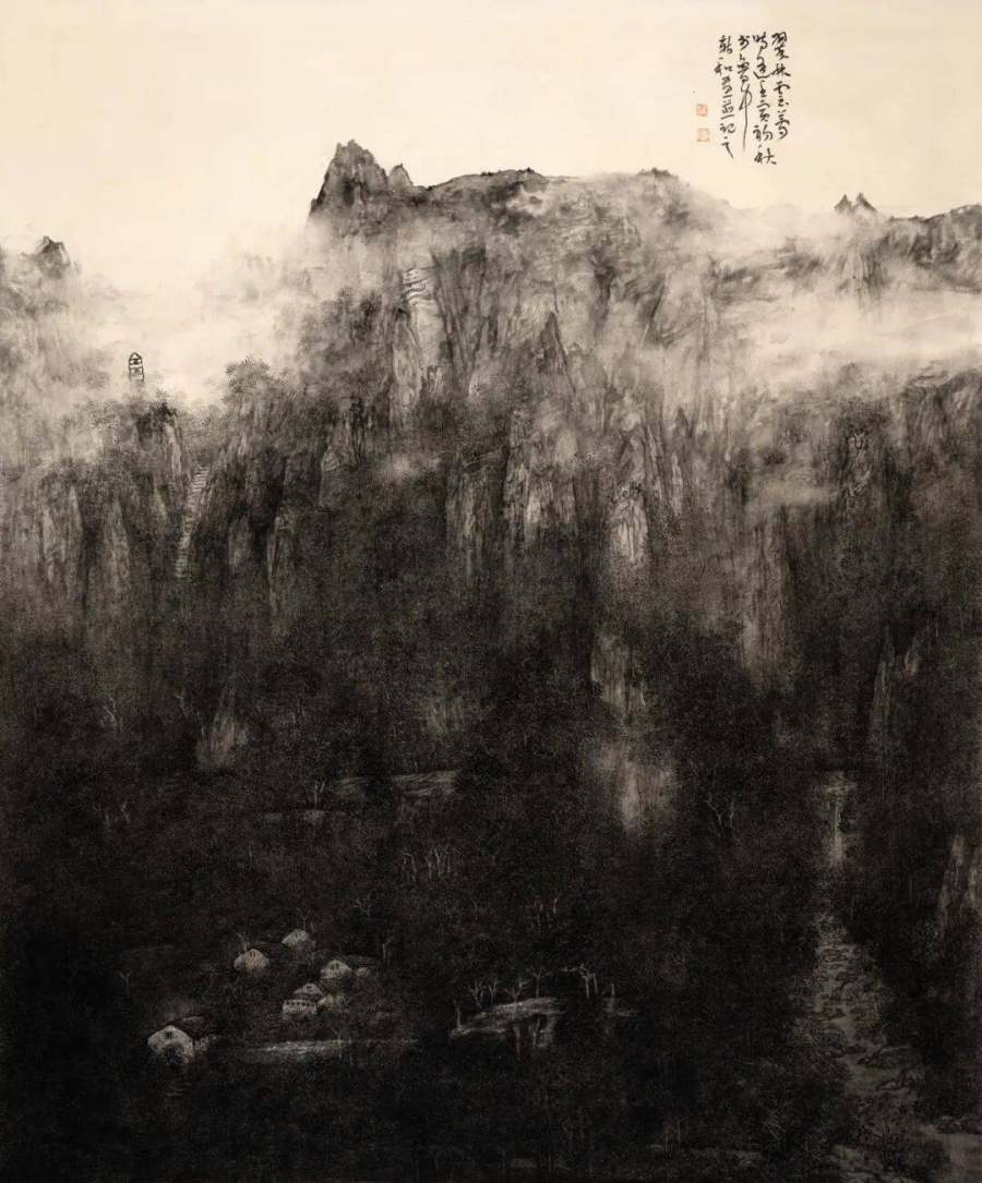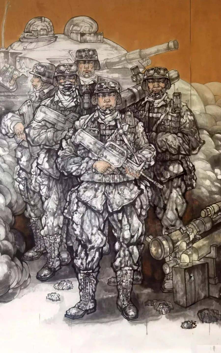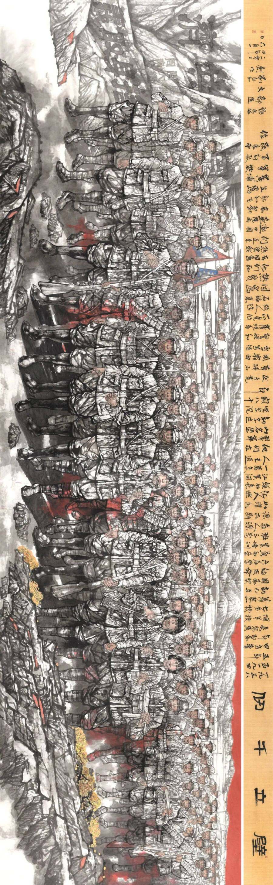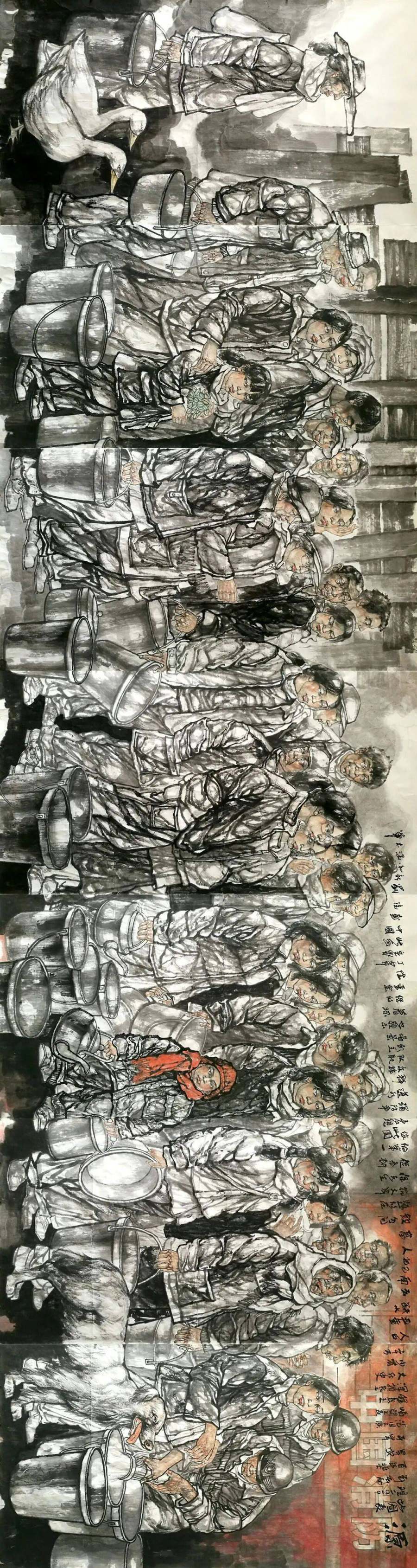 新和兄是从清华园走出来的画家,而且专业是艺术设计,所以他身上既带着中国学院派艺术家的典型印记,又深受当代艺术思潮的浸染。因而,他的人物画创作,恰似一棵根系扎在传统土壤里、枝叶却向着现代天空舒展的树。苏东坡在论吴道子的画时说“出新意于法度之中,寄妙理于豪放之外”,大概是说画贵有新意,而新意则不能离开法度,同时风格可以豪放,但豪放之外却要让读者感到余味无穷。要达到这种境界,当然需要形与神、景与情的高度契合。新和兄的人物作品,总能发掘出对象的本质特征,做到形与神、景与情的结合,使其作品的精神境界得以升华。比如2024年6月,为纪念黄埔军校百年,相关部门邀请他创作了《壁立千仞》,这是一幅具宏大叙事的画卷,长达7.15米,宽达2.26米,重现了黄埔军校学员报效国家、民族的一段铁血历史。在此作中,新和兄特别注重位置、动势、氛围等的描绘,散整、疏密、远近、虚实配置得当,有阔笔纵横以求整体效果的生动,又有对脸部与手部细微动作的入微,墨色浓淡间藏着刚劲的笔触,既保留了传统水墨的写意韵味,又像电影镜头般充满戏剧张力。这幅表现特定时代的特定群像,经过他精妙的位置经营,在与留白的对比之下制造了宽广的空间感,层层堆叠出的群体厚重感,飞白笔触勾画的个体特征感,使画面像交响乐般层次分明。此作品刻画与表现的虽然是英雄群像,但新和兄并没有将其刻画成高高在上的符号,而是带着泥土气息与战斗痕迹的有血有肉的普通战士,他们视死如归地站成了一座千仞的让敌人无法逾越的山壁,从而彰显了不屈的民族精神。