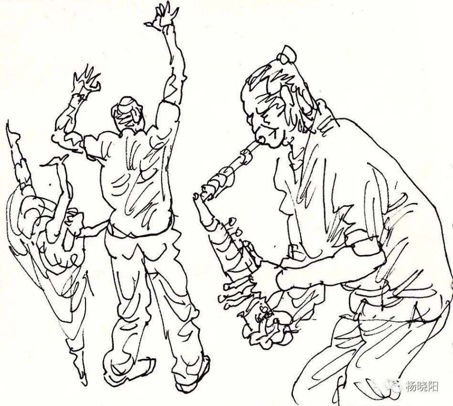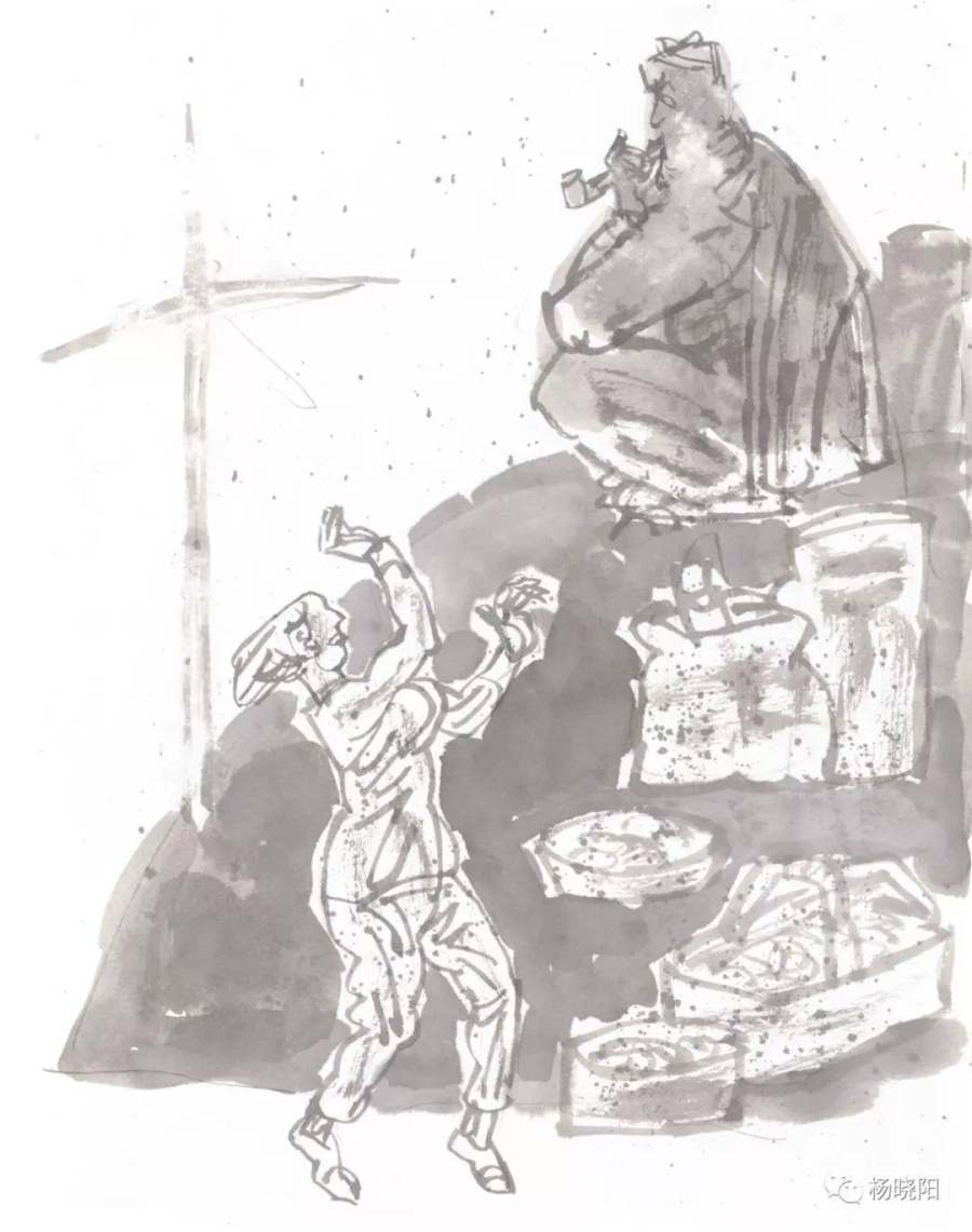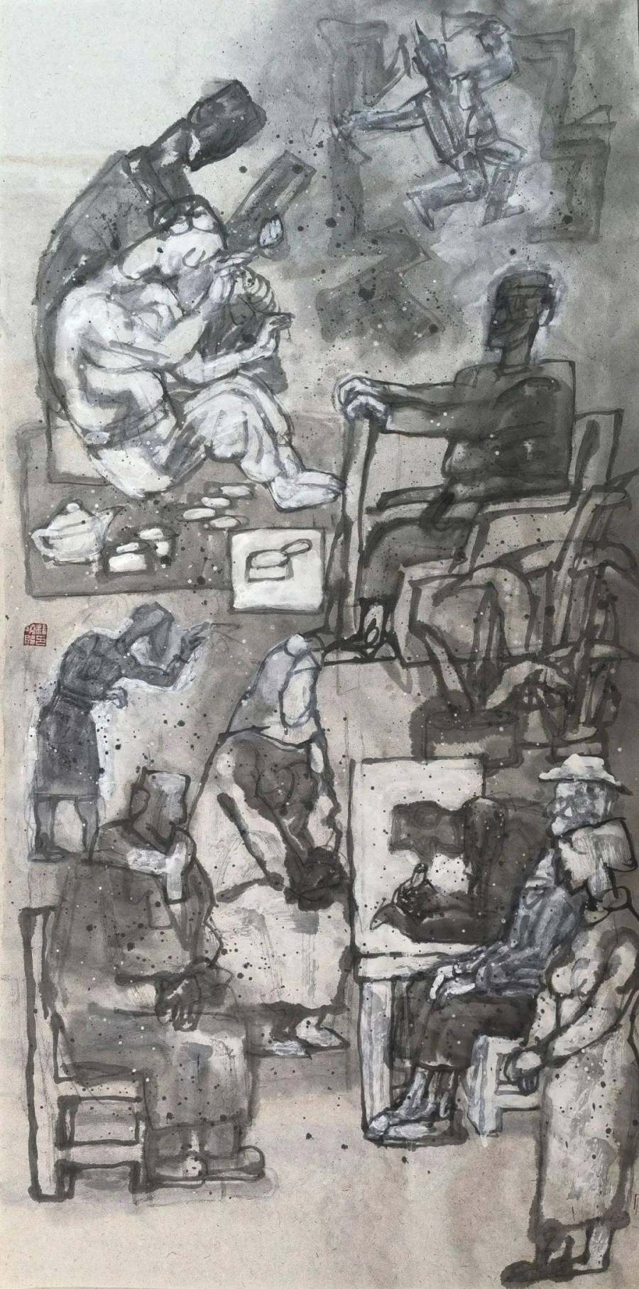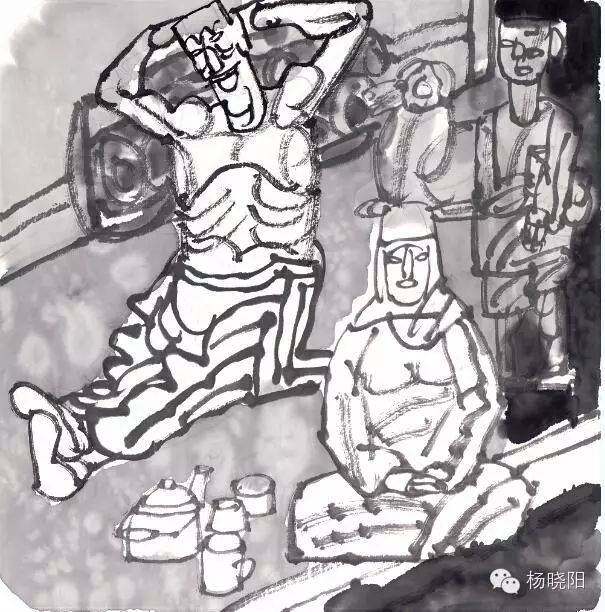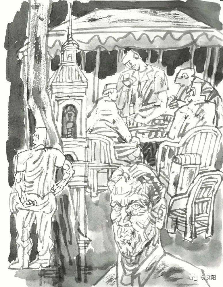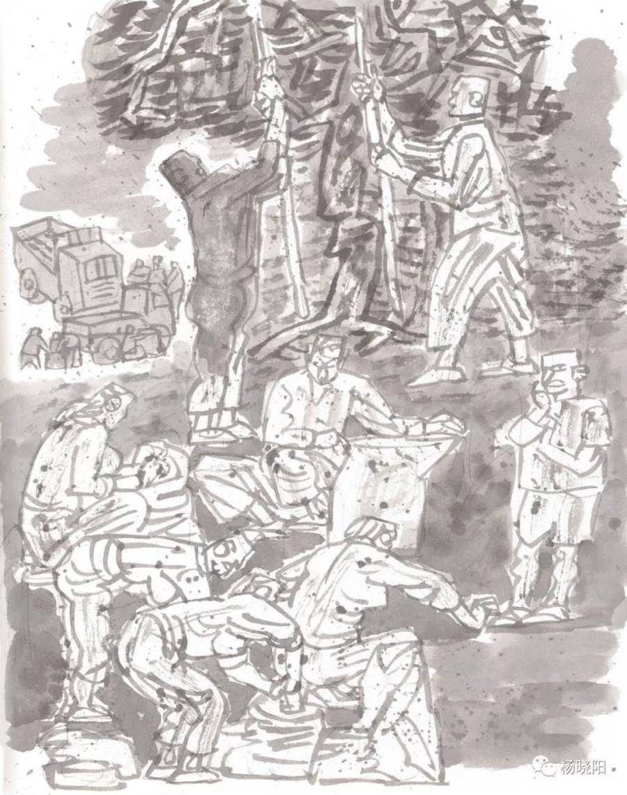 但是写生本身也是一种独立的艺术表现形式,体现出艺术家的思考和个性。应该注意的是,尽管写生这个概念来自西方,但在几十年的实践中已经融汇了中西两种写生的概念与方法,特别是在中国画的写生中,这种融汇显得更为突出。由此观察,杨晓阳的写生就是这种融汇的结果。杨晓阳继承了其老师刘文西坚实的造型和把握大场面的能力,非常重视到生活中去获取创作的灵感。他在几十年坚持不懈的写生中,积累了丰富的生活经验,练就了坚实的基本功,这也使他获得了快速把握多人物、多场景的复杂画面的手段。他的速写写生注重对对象的整体感受的表达,但同时又注意细节的丰富性。特别是他不仅形成善于构建画面的完整感和作品感的特征,而且也逐步形成了其朴实、生动、完整的速写风格。这为其水墨写意画奠定了基础,且已形成独立的艺术作品。