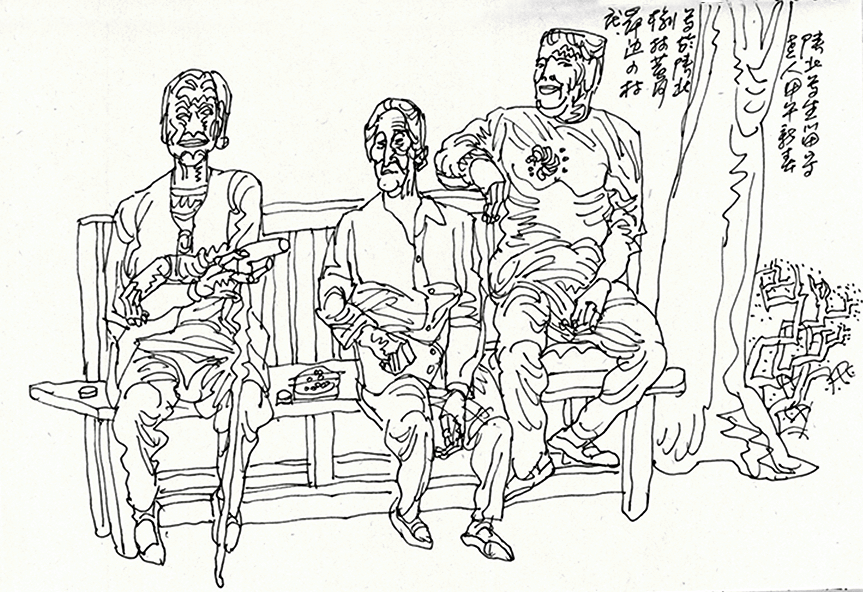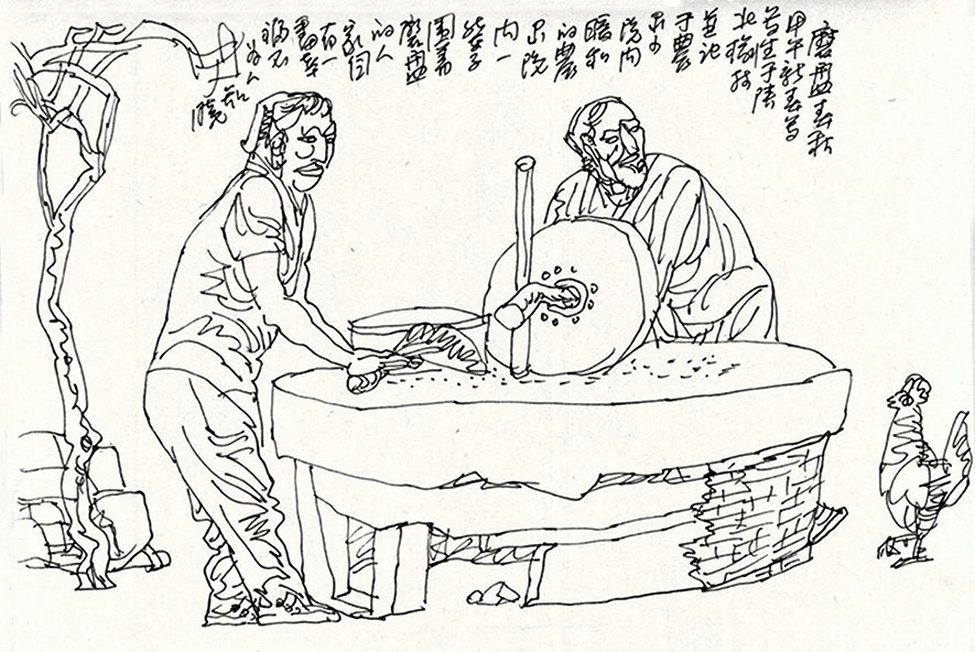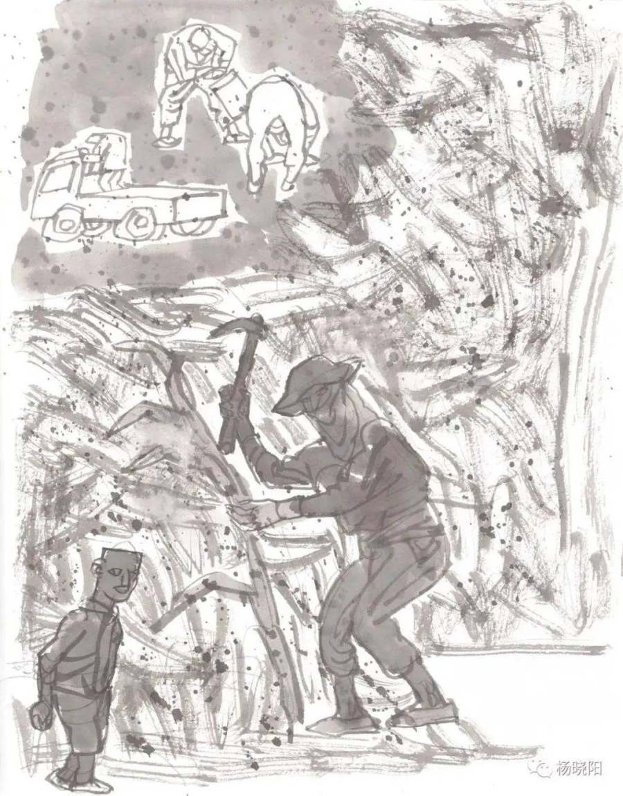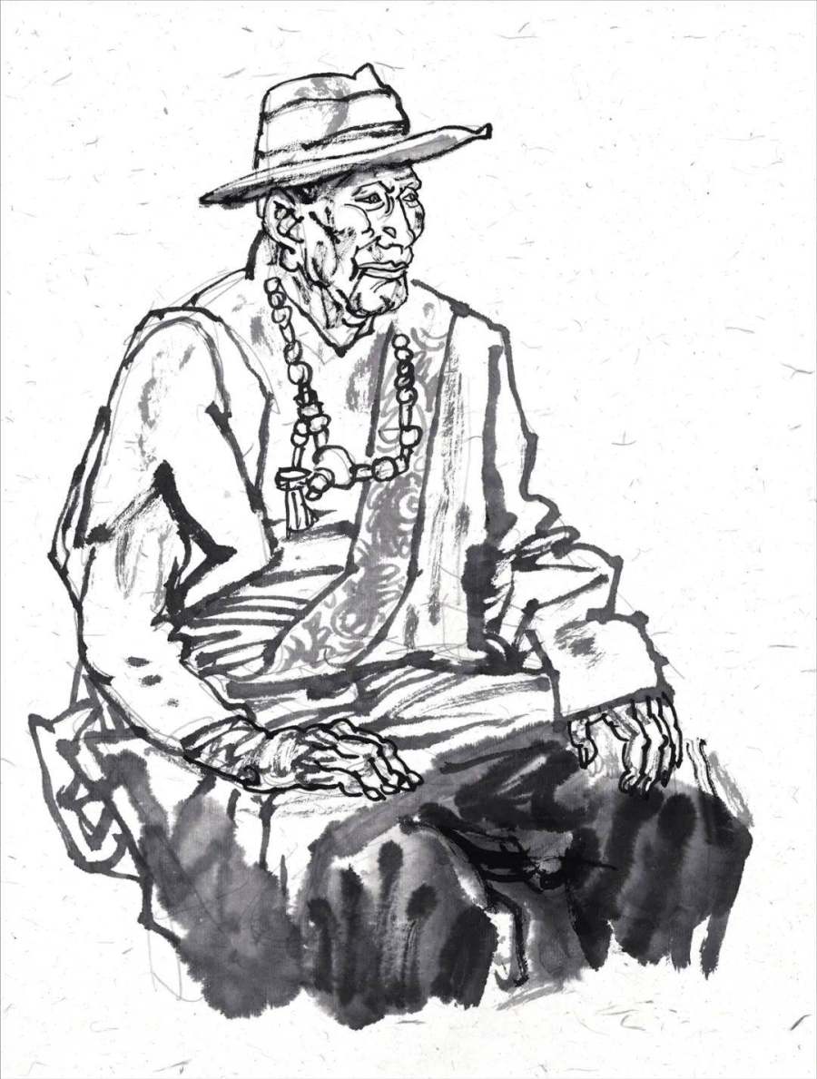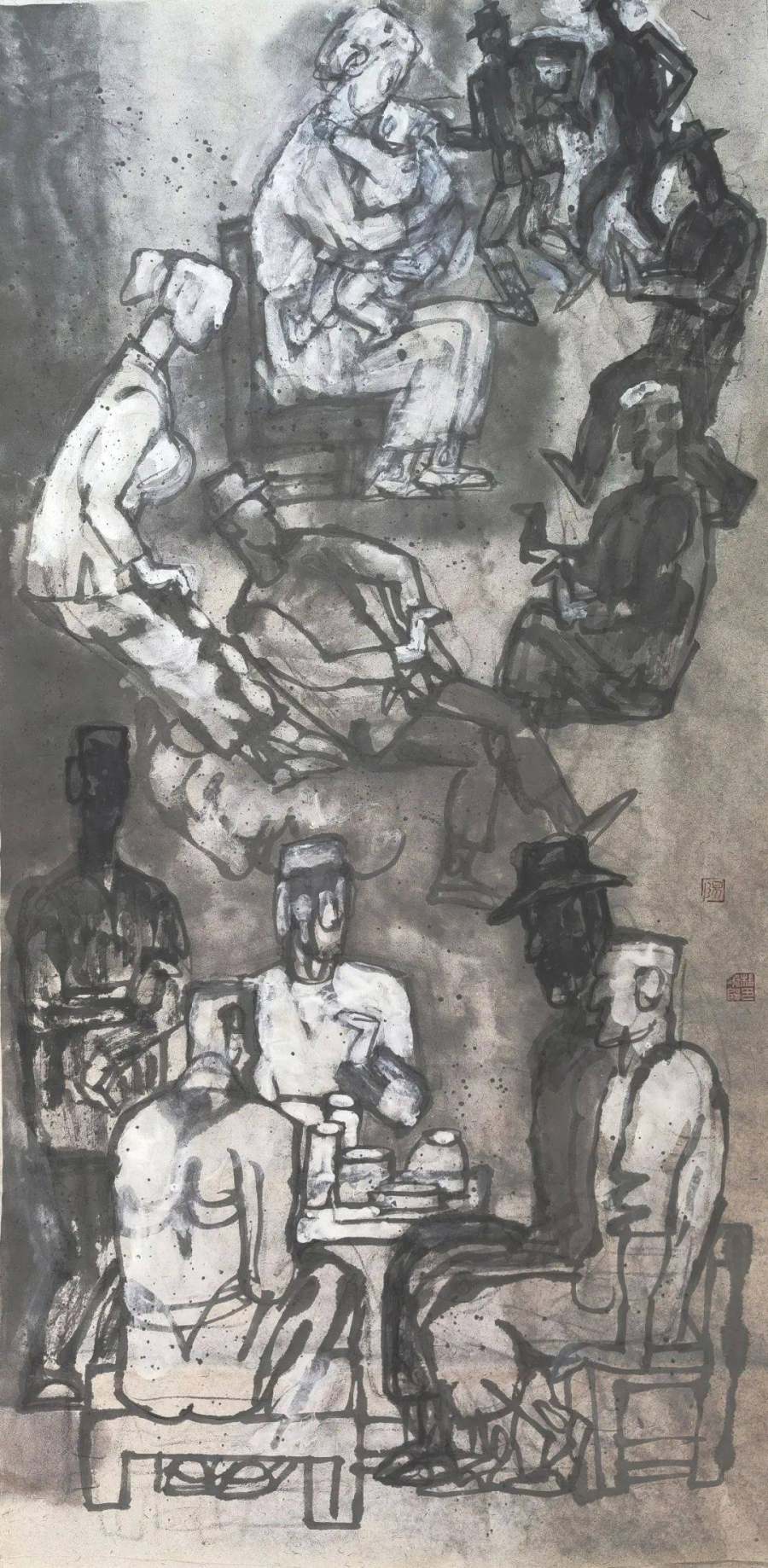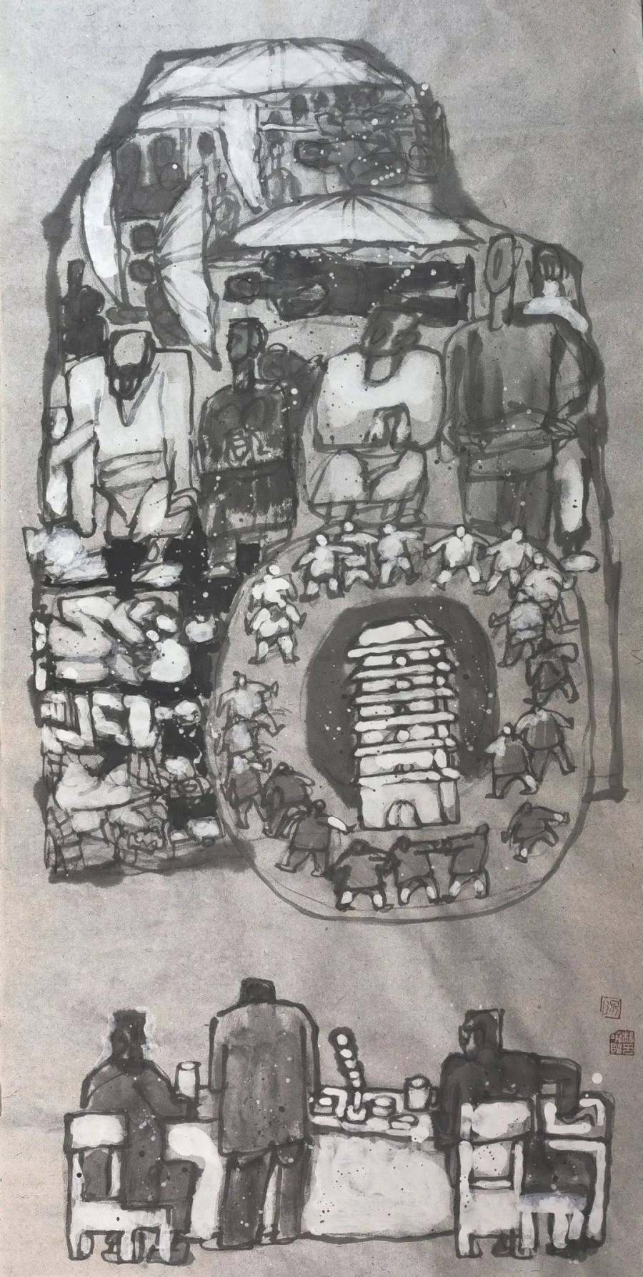 但是写生本身也是一种独立的艺术表现形式,体现出艺术家的思考和个性。应该注意的是,尽管写生这个概念来自西方,但在几十年的实践中已经融汇了中西两种写生的概念与方法,特别是在中国画的写生中,这种融汇显得更为突出。由此观察,杨晓阳的写生就是这种融汇的结果。杨晓阳继承了其老师刘文西坚实的造型和把握大场面的能力,非常重视到生活中去获取创作的灵感。他在几十年坚持不懈的写生中,积累了丰富的生活经验,练就了坚实的基本功,这也使他获得了快速把握多人物、多场景的复杂画面的手段。他的速写写生注重对对象的整体感受的表达,但同时又注意细节的丰富性。特别是他不仅形成善于构建画面的完整感和作品感的特征,而且也逐步形成了其朴实、生动、完整的速写风格。这为其水墨写意画奠定了基础,且已形成独立的艺术作品。