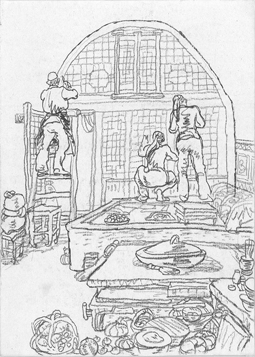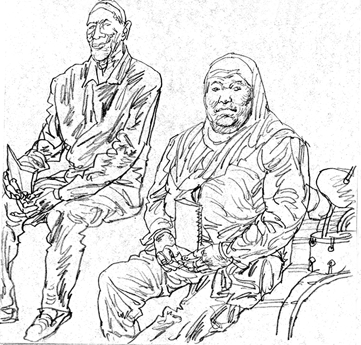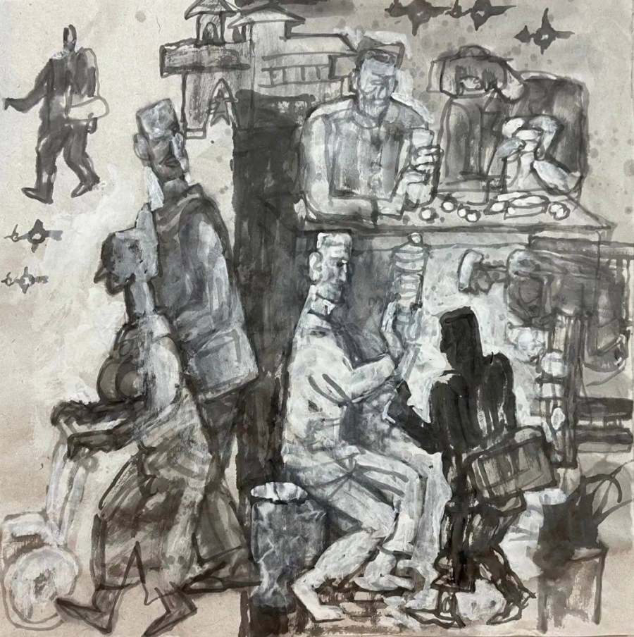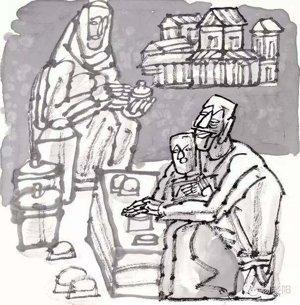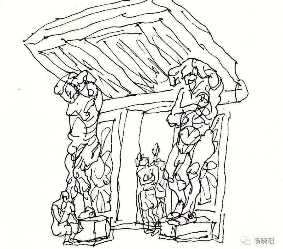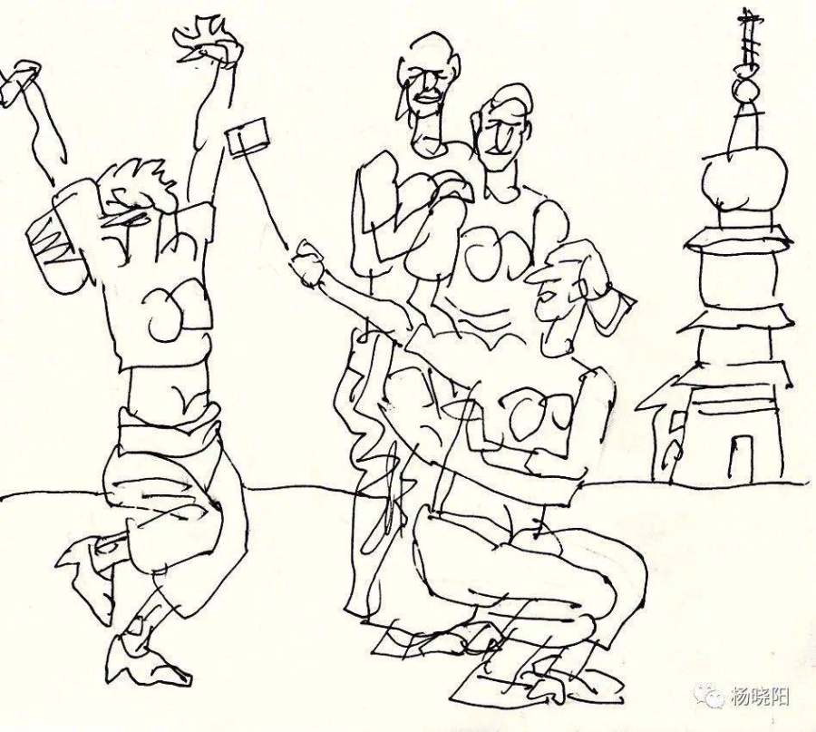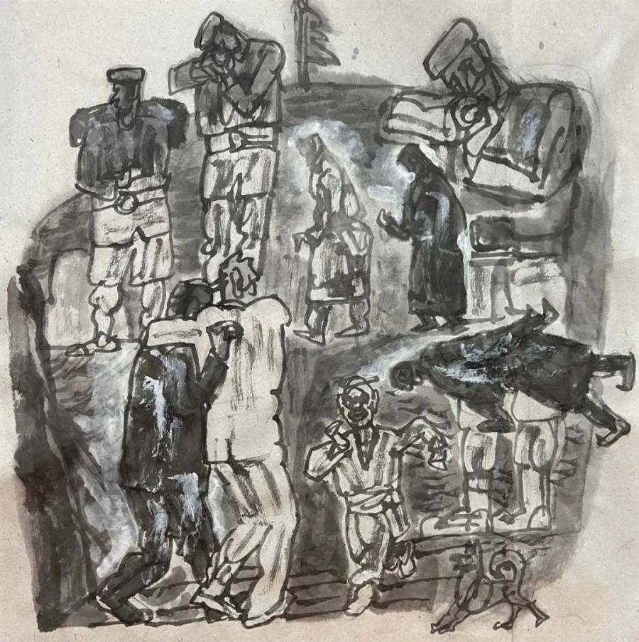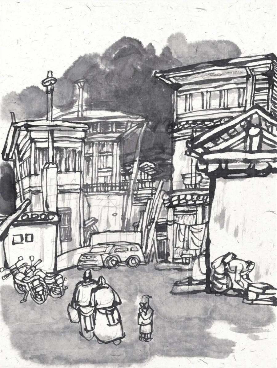 但是写生本身也是一种独立的艺术表现形式,体现出艺术家的思考和个性。应该注意的是,尽管写生这个概念来自西方,但在几十年的实践中已经融汇了中西两种写生的概念与方法,特别是在中国画的写生中,这种融汇显得更为突出。由此观察,杨晓阳的写生就是这种融汇的结果。杨晓阳继承了其老师刘文西坚实的造型和把握大场面的能力,非常重视到生活中去获取创作的灵感。他在几十年坚持不懈的写生中,积累了丰富的生活经验,练就了坚实的基本功,这也使他获得了快速把握多人物、多场景的复杂画面的手段。他的速写写生注重对对象的整体感受的表达,但同时又注意细节的丰富性。特别是他不仅形成善于构建画面的完整感和作品感的特征,而且也逐步形成了其朴实、生动、完整的速写风格。这为其水墨写意画奠定了基础,且已形成独立的艺术作品。