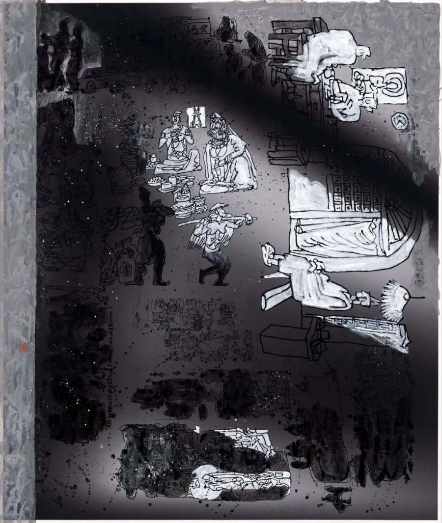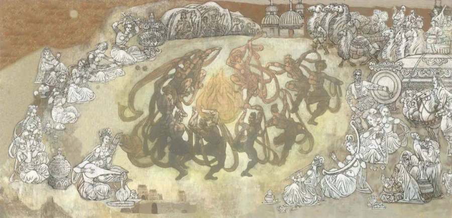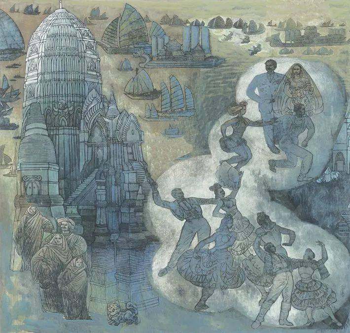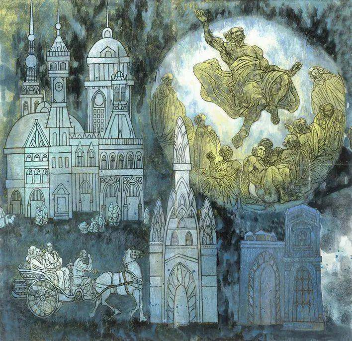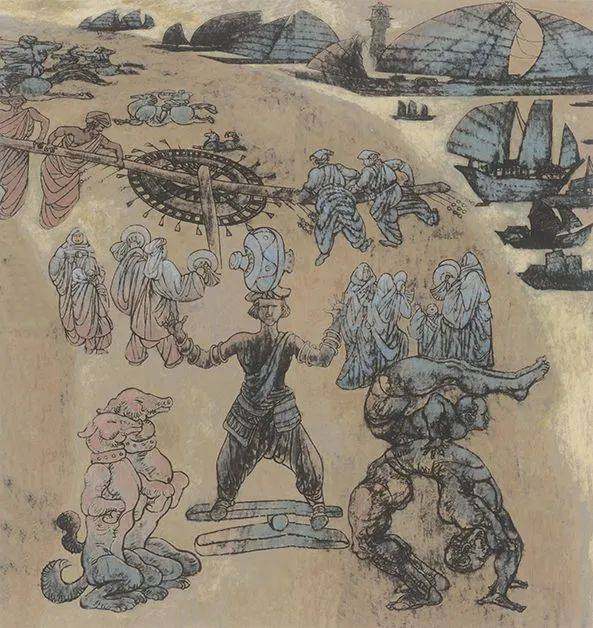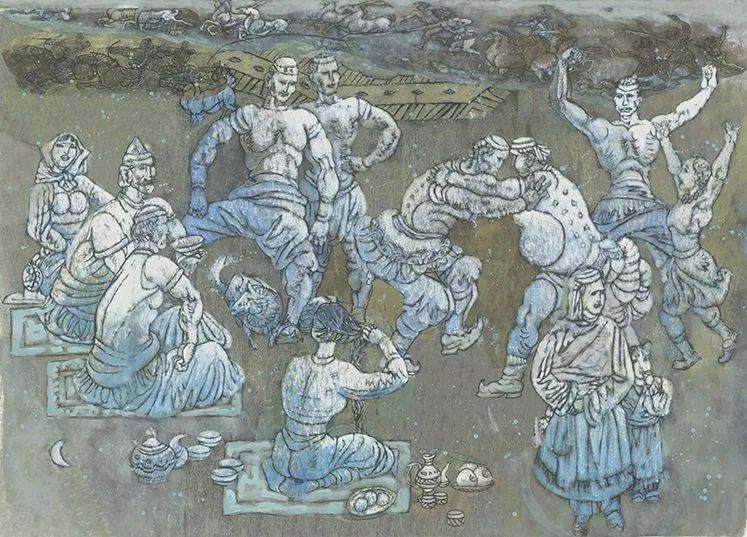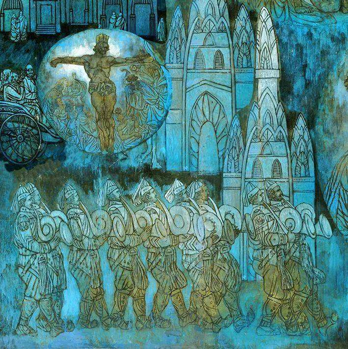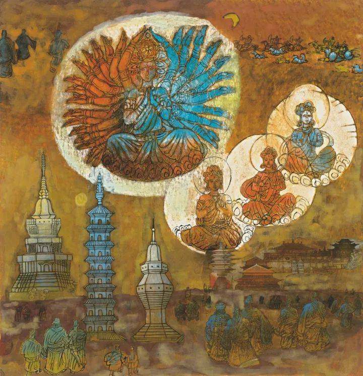 纵观杨晓阳的重彩作品,大致有三种类型:学习传统的青绿重彩、融汇中西的现代重彩和借鉴壁画因素的写意型重彩。自上世纪八十年代起,杨晓阳就开始关注色彩语言及其表现力问题,并在一系列大型作品中进行了探索。这些以中国传统青绿为主的早期作品在色彩上突出了其清雅、高古的格调,而进入九十年代之后却又几乎同时开拓出中西融合型和重彩写意型两个方向。其中西融合型作品在中国传统色彩用法基础上融入了西画的色彩原理,通过借鉴西画色彩的科学性与光感而增强了画面的空间感与视觉表现,并在中西艺术的交融、转换、对比之间,和不同时空的交错之中,构建起一种场面宏大、色彩瑰丽的艺术空间。而其写意型作品则把色彩作为一种意境的烘托,并把线描的塑造作用亦融入这种意境之中,从而使人形成苍莽、遥远的历史想象。实际上,这三个方面在时间上并无截然的分割,而是相互交错。这不仅表现出其在中国画色彩方面的广泛研究兴趣,而且也表明了其综合的修养以及开阔的国际视野、历史意识和多种材料手段的自由运用。