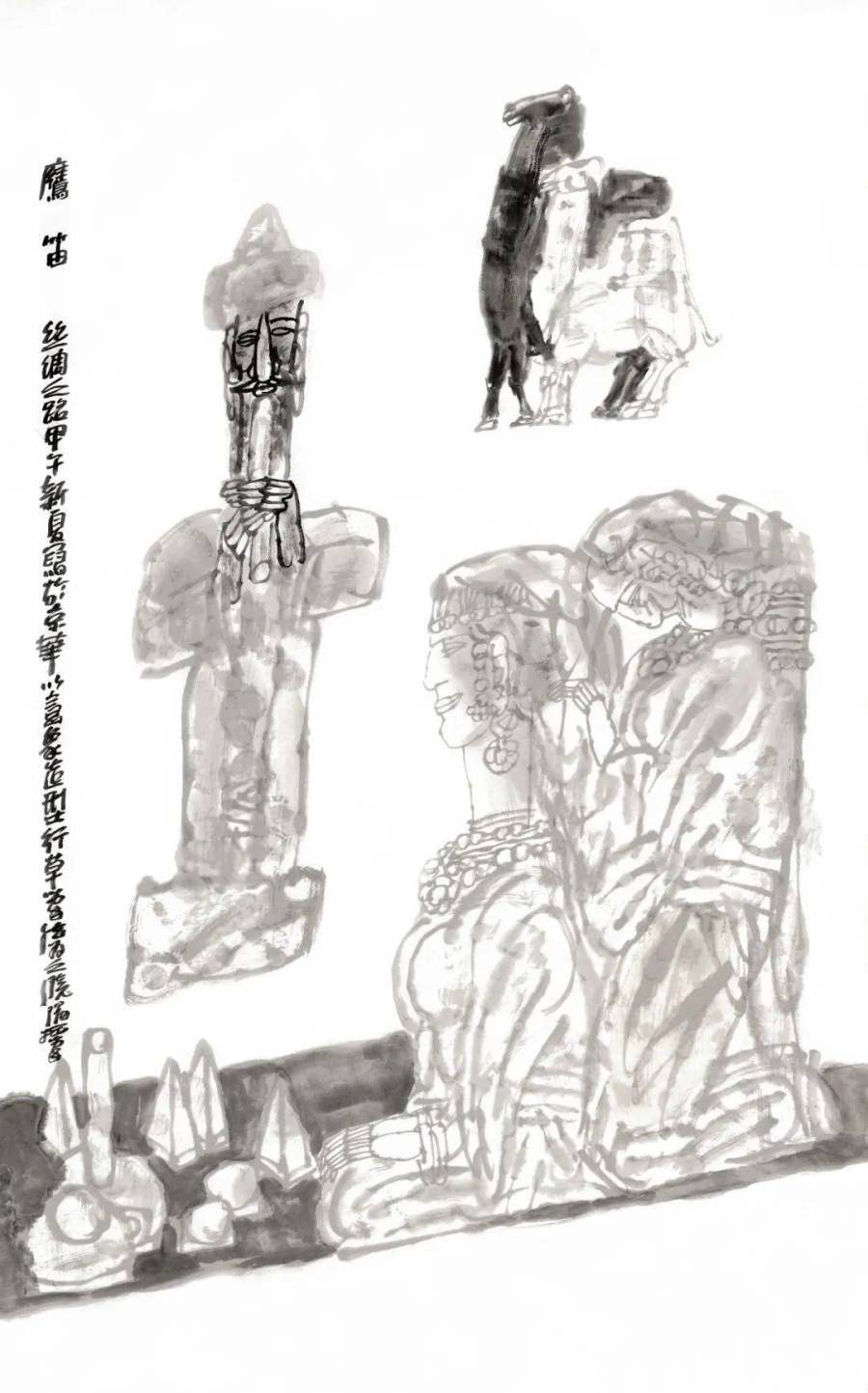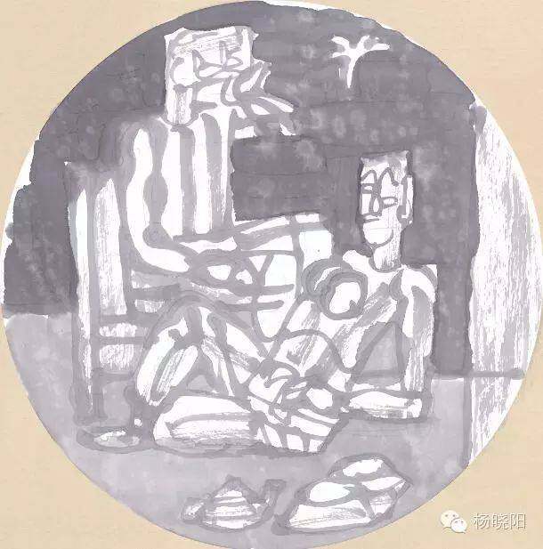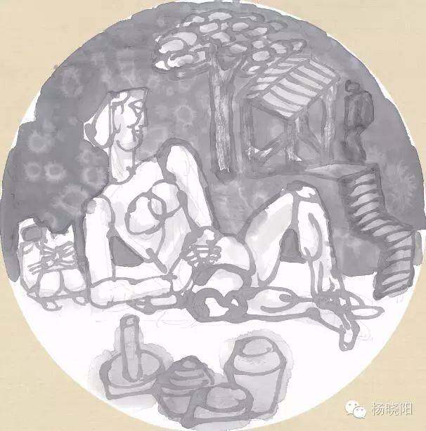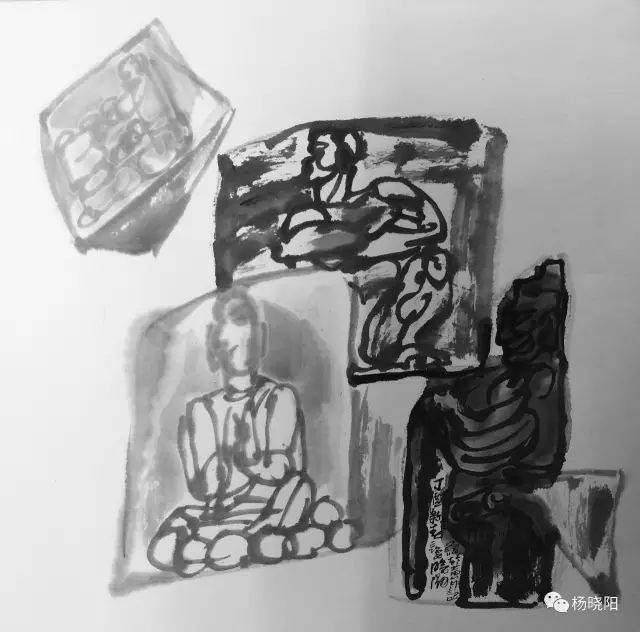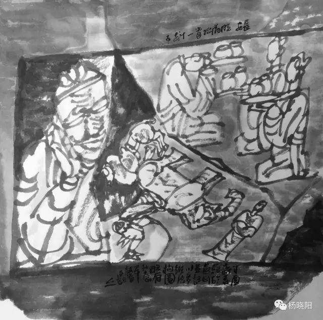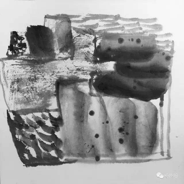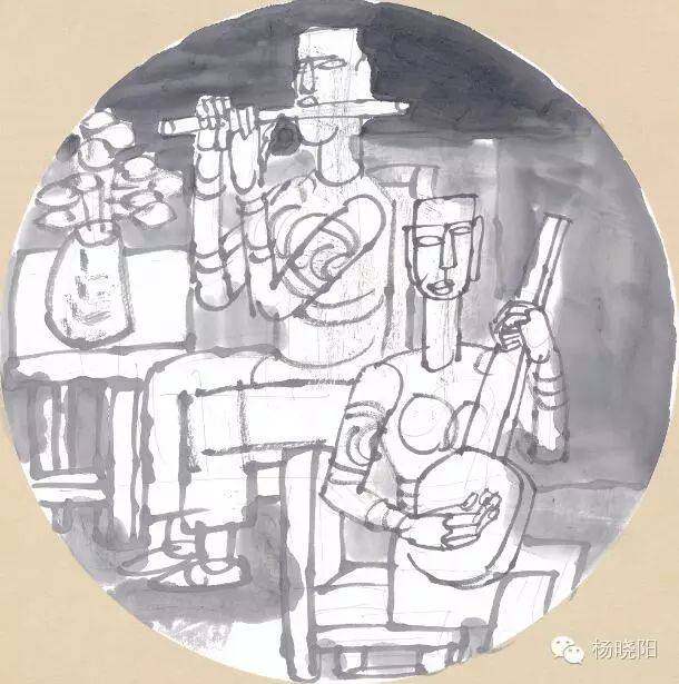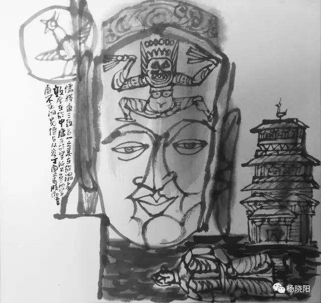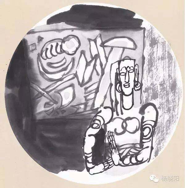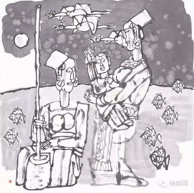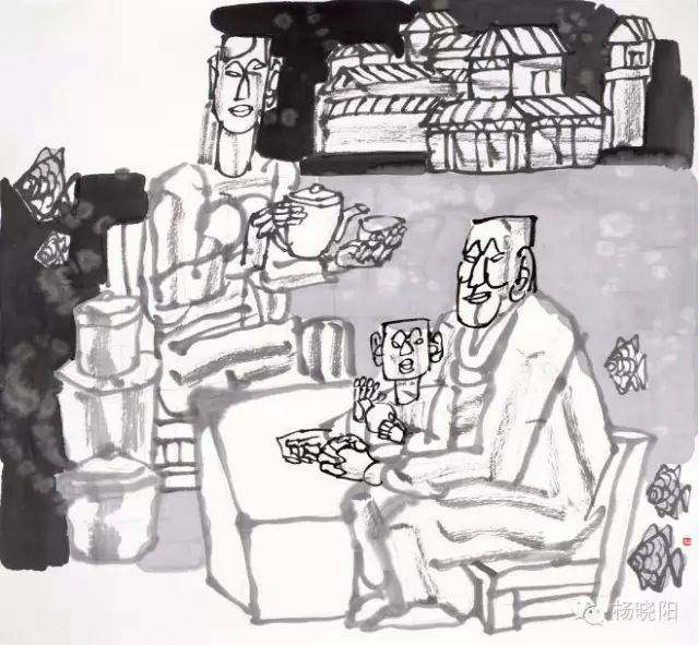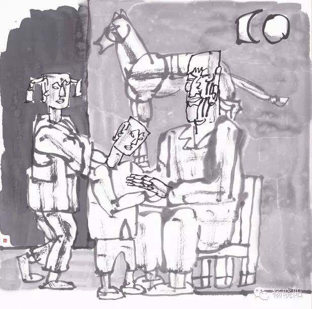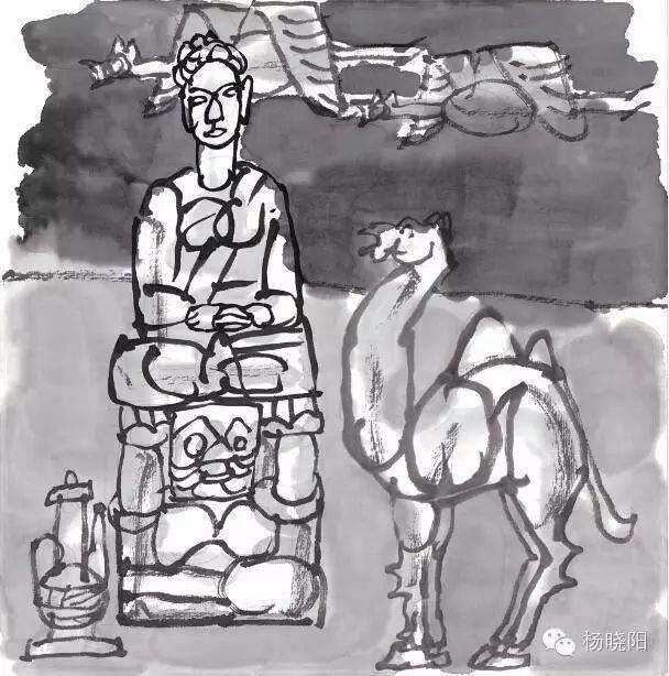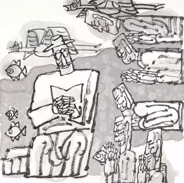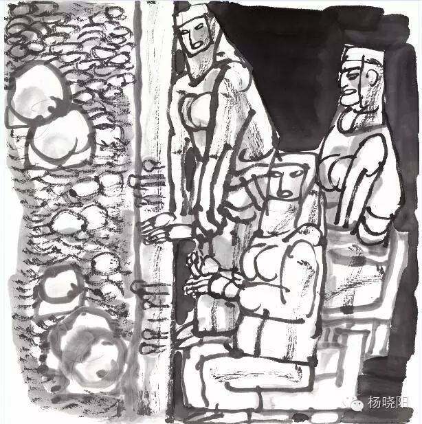大约从2000年开始,杨晓阳开始着重致力于写意水墨画的探索和研究。他的大量速写为其水墨画实践奠定了风格上的基础。尤其是他近些年在造型上日趋简洁、概括,甚至呈现出几何化、程式化趋向,这对于艺术家来说,是一个从复杂、绚烂走向简括、平淡的过程,也是一个艺术家成熟的标志。也正因此,他的水墨画不仅在造型上进行了大跨度的变形,而且在构图上具有了平面构成的意味。这种表达方式看似吸收了现代艺术的因素,实际上是对中国传统造型方式的现代演化,其中包含了青铜器、汉画像石和诸如西北栓马桩这样的民间艺术等方面。更让我们注意的是,在依照中国传统造型法则吸收现代艺术形式语言的同时,他的水墨画仍然遵循了传统中国画以书入画的原则,将书法用笔揉入线条之中,使之画面更具变化和韵味。特别是他的石鼓和魏碑笔法不仅增加了线条的厚重和力度,也与他的古拙的造型相吻合。这些都体现了他题材模糊化、主题多义化、造型意象化、章法多维化、用笔书法化的艺术追求。杨晓阳也因此而在当代水墨艺术家中独树一帜。他清晰的四个段落表现出一种不断超越自己的艺术家的轨迹,给我们以深刻的启示。