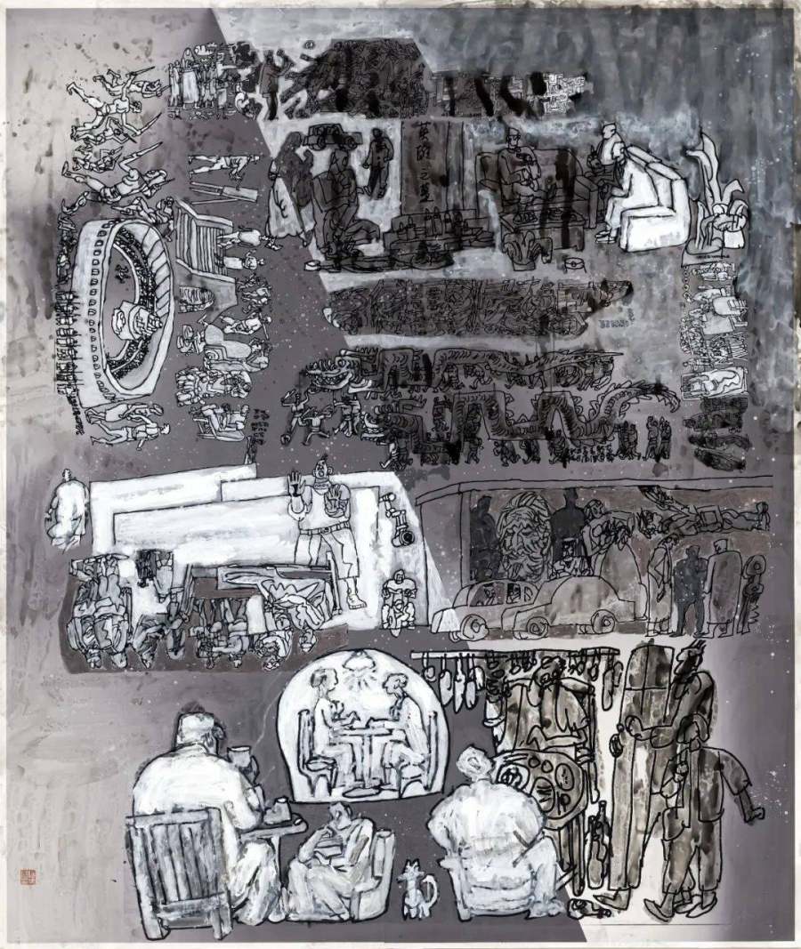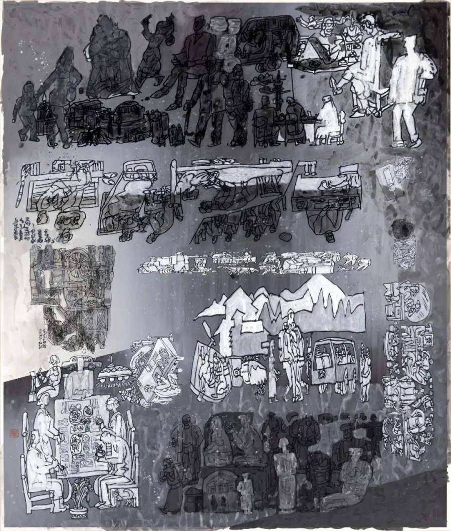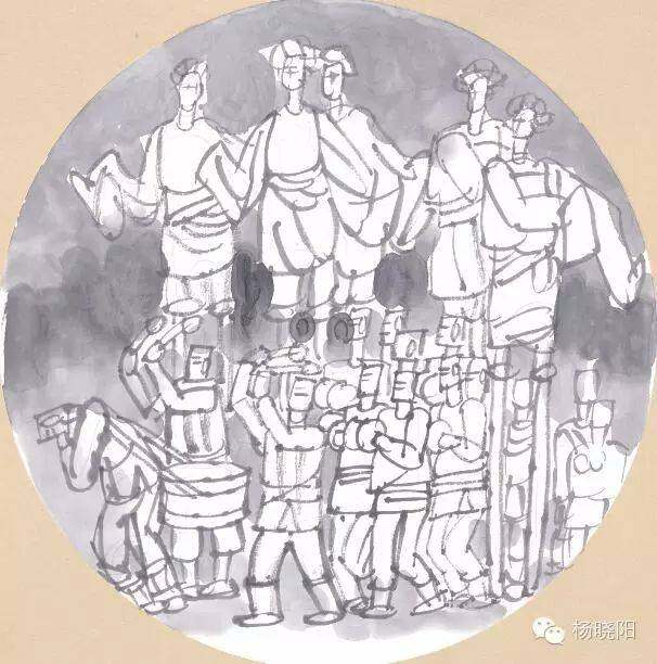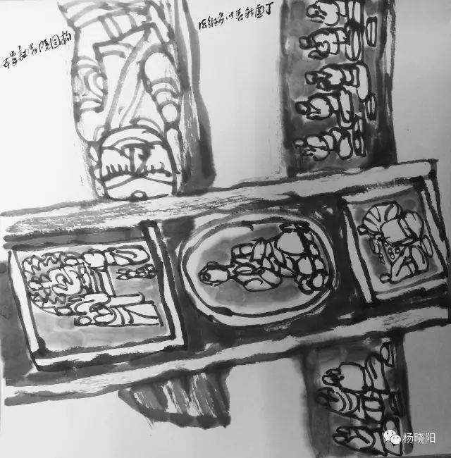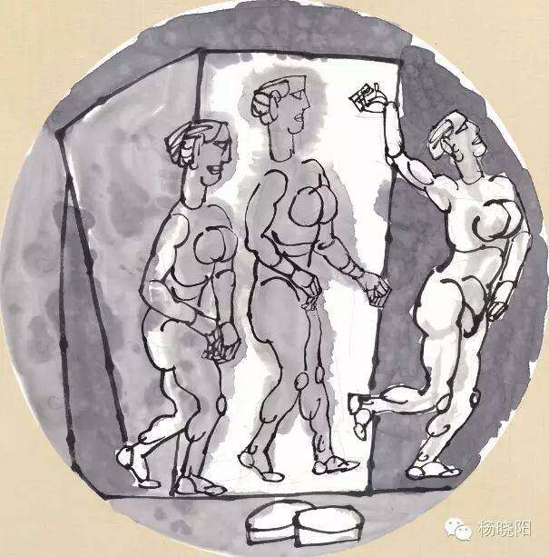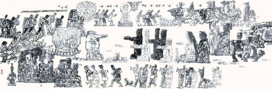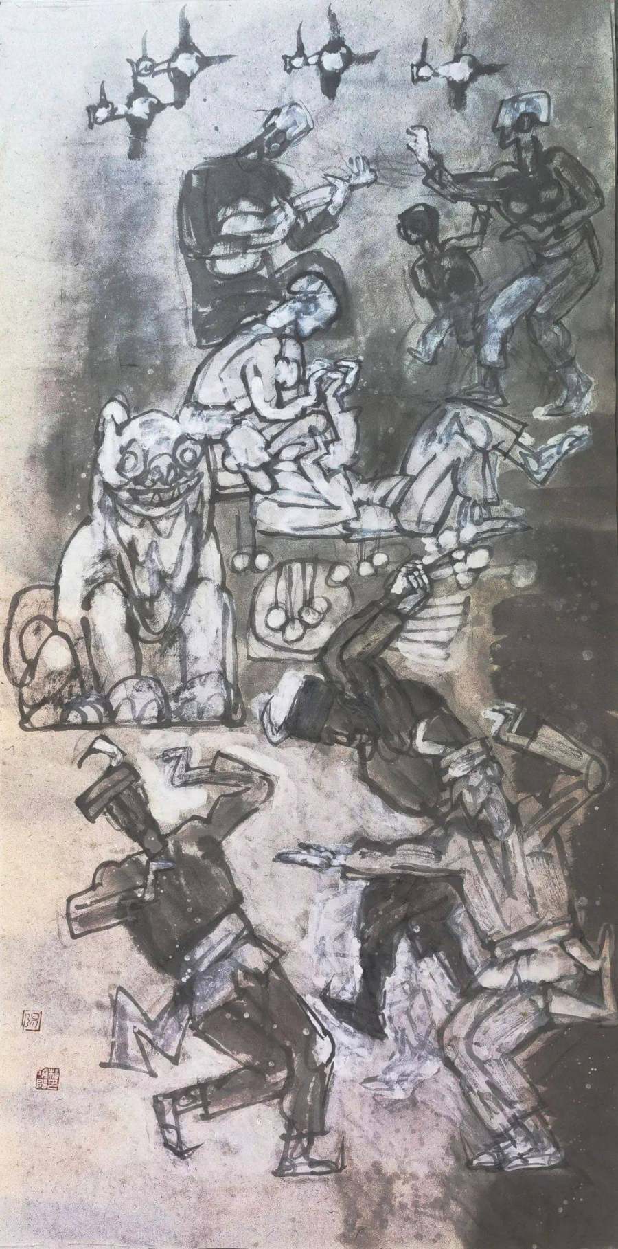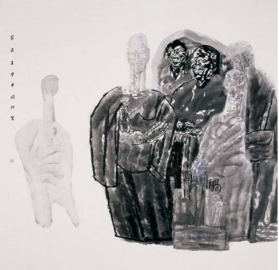 大约从2000年开始,杨晓阳开始着重致力于写意水墨画的探索和研究。他的大量速写为其水墨画实践奠定了风格上的基础。尤其是他近些年在造型上日趋简洁、概括,甚至呈现出几何化、程式化趋向,这对于艺术家来说,是一个从复杂、绚烂走向简括、平淡的过程,也是一个艺术家成熟的标志。也正因此,他的水墨画不仅在造型上进行了大跨度的变形,而且在构图上具有了平面构成的意味。这种表达方式看似吸收了现代艺术的因素,实际上是对中国传统造型方式的现代演化,其中包含了青铜器、汉画像石和诸如西北栓马桩这样的民间艺术等方面。更让我们注意的是,在依照中国传统造型法则吸收现代艺术形式语言的同时,他的水墨画仍然遵循了传统中国画以书入画的原则,将书法用笔揉入线条之中,使之画面更具变化和韵味。特别是他的石鼓和魏碑笔法不仅增加了线条的厚重和力度,也与他的古拙的造型相吻合。这些都体现了他题材模糊化、主题多义化、造型意象化、章法多维化、用笔书法化的艺术追求。杨晓阳也因此而在当代水墨艺术家中独树一帜。他清晰的四个段落表现出一种不断超越自己的艺术家的轨迹,给我们以深刻的启示。