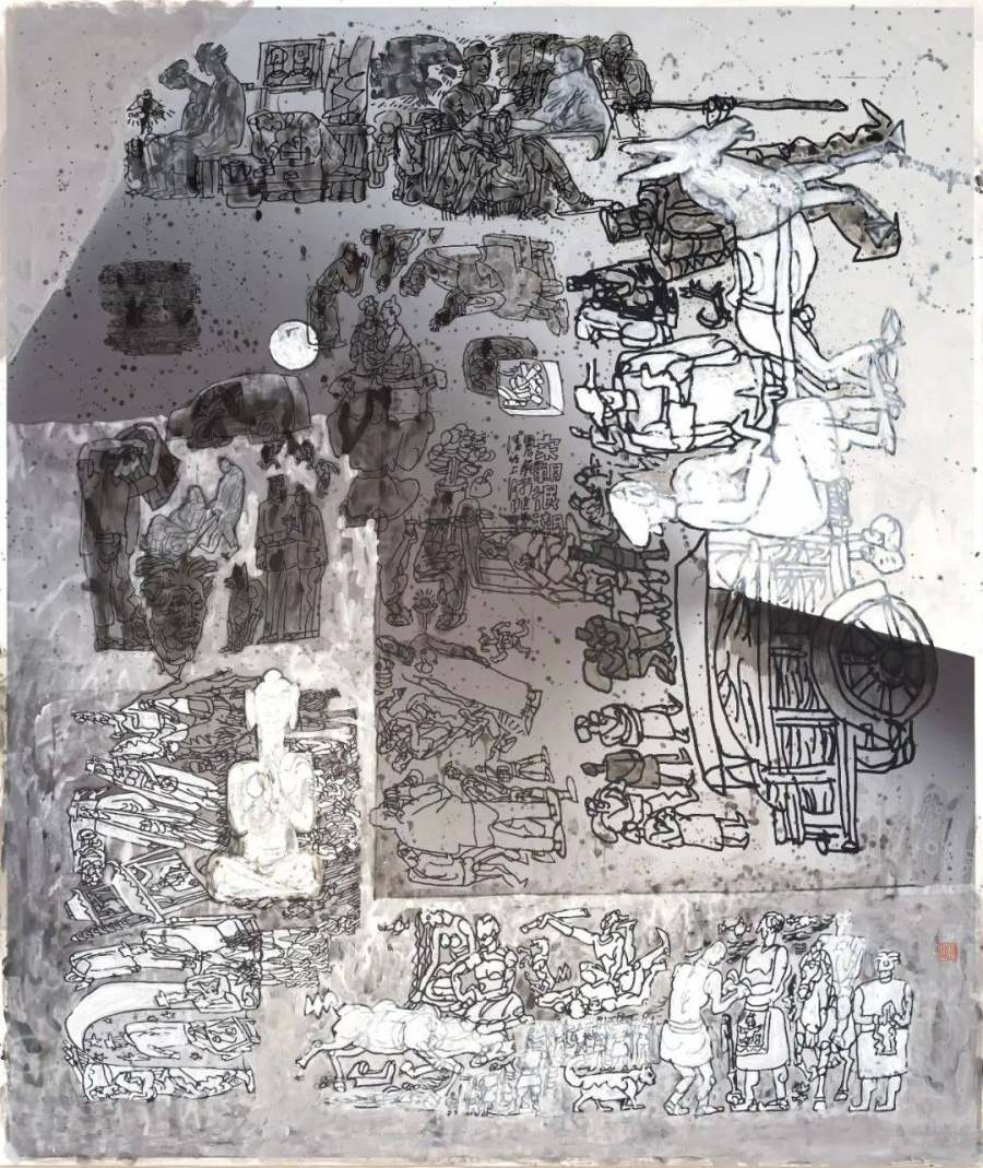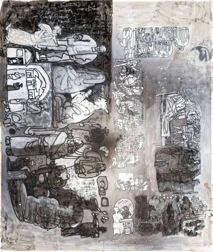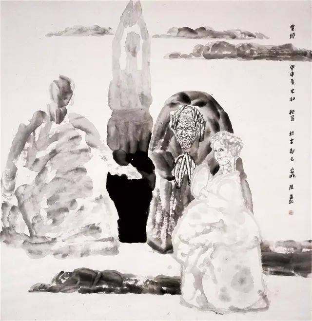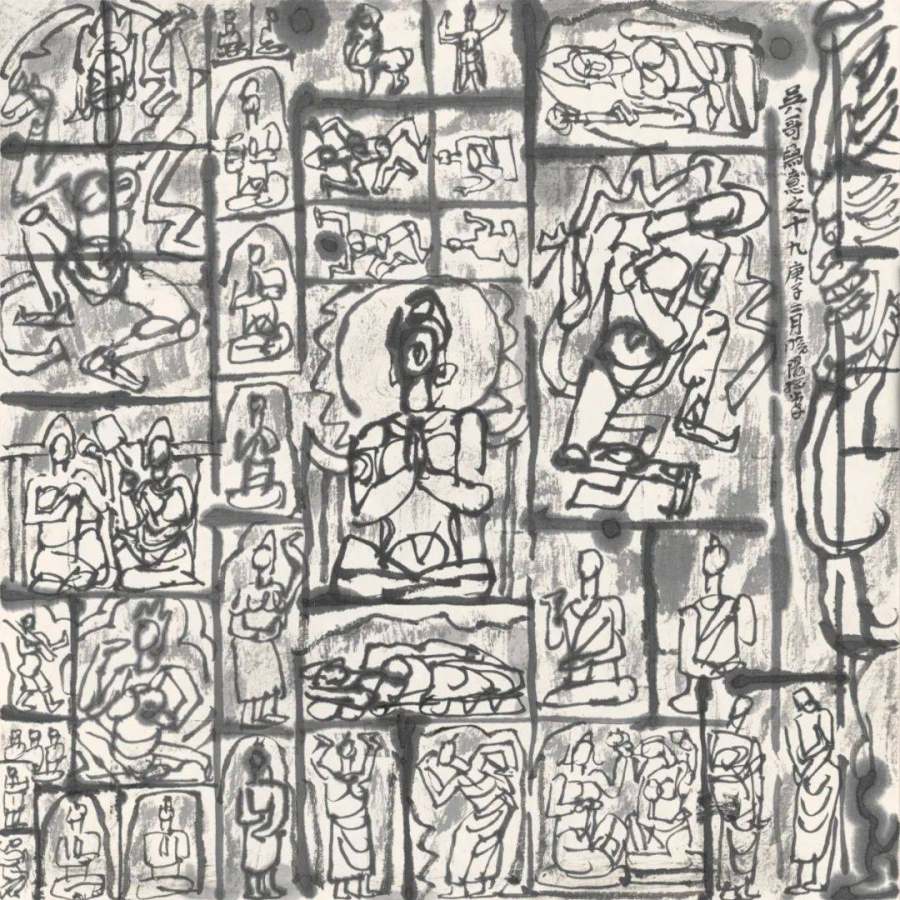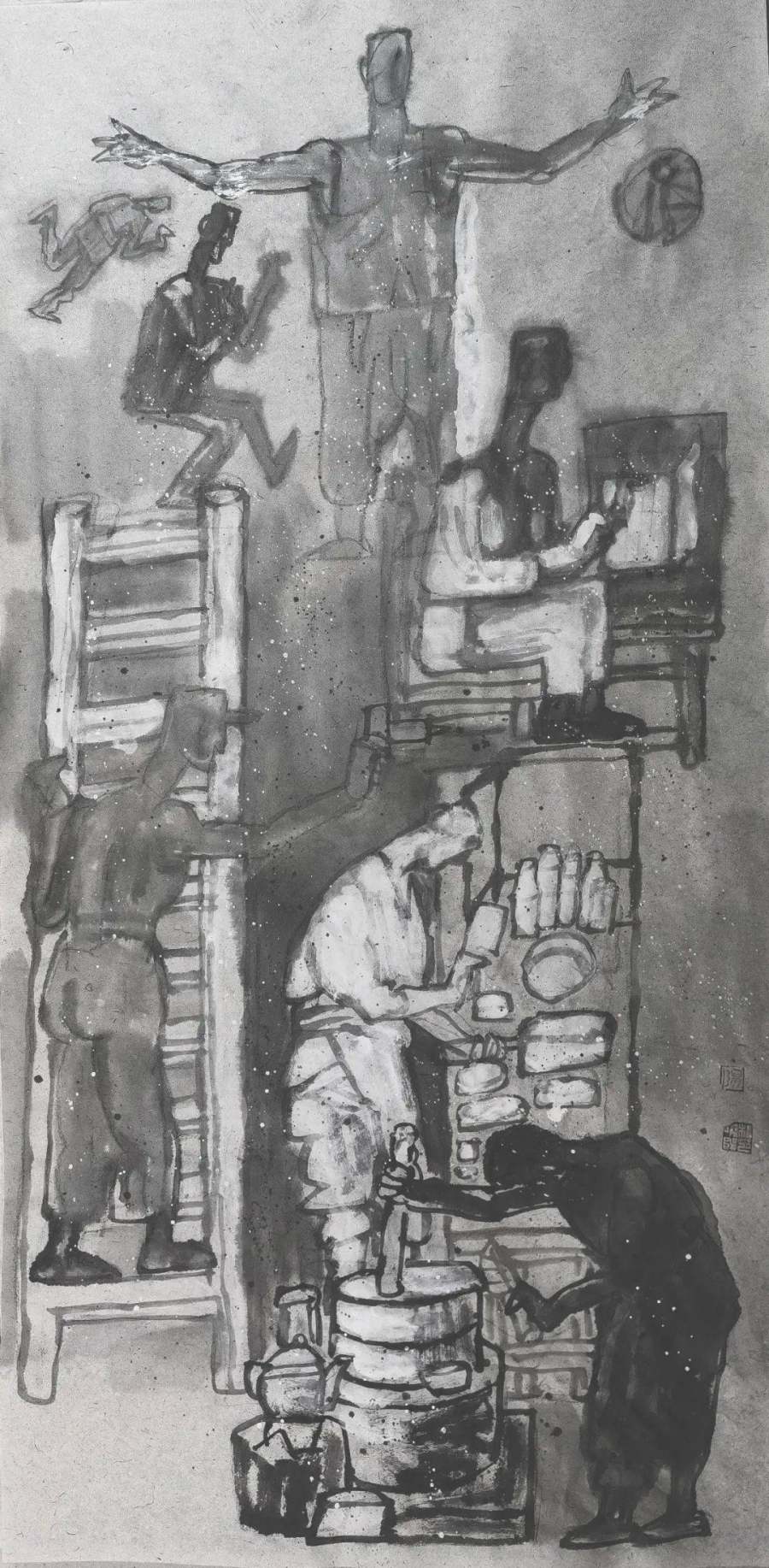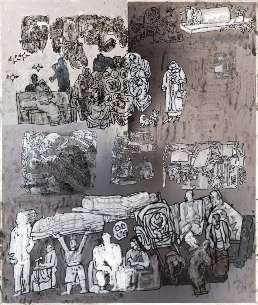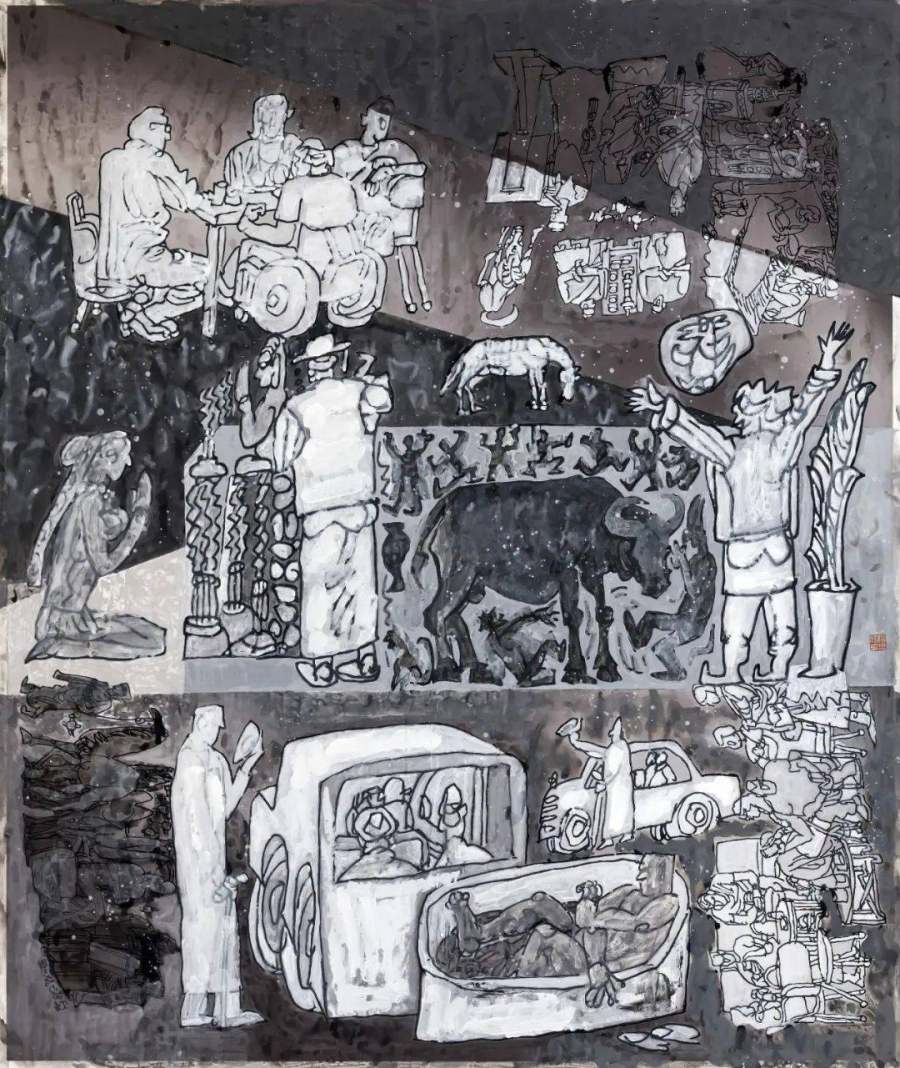 大约从2000年开始,杨晓阳开始着重致力于写意水墨画的探索和研究。他的大量速写为其水墨画实践奠定了风格上的基础。尤其是他近些年在造型上日趋简洁、概括,甚至呈现出几何化、程式化趋向,这对于艺术家来说,是一个从复杂、绚烂走向简括、平淡的过程,也是一个艺术家成熟的标志。也正因此,他的水墨画不仅在造型上进行了大跨度的变形,而且在构图上具有了平面构成的意味。这种表达方式看似吸收了现代艺术的因素,实际上是对中国传统造型方式的现代演化,其中包含了青铜器、汉画像石和诸如西北栓马桩这样的民间艺术等方面。更让我们注意的是,在依照中国传统造型法则吸收现代艺术形式语言的同时,他的水墨画仍然遵循了传统中国画以书入画的原则,将书法用笔揉入线条之中,使之画面更具变化和韵味。特别是他的石鼓和魏碑笔法不仅增加了线条的厚重和力度,也与他的古拙的造型相吻合。这些都体现了他题材模糊化、主题多义化、造型意象化、章法多维化、用笔书法化的艺术追求。杨晓阳也因此而在当代水墨艺术家中独树一帜。他清晰的四个段落表现出一种不断超越自己的艺术家的轨迹,给我们以深刻的启示。