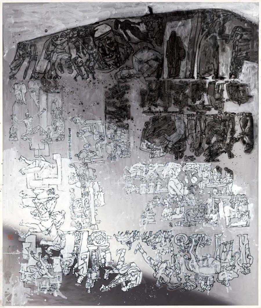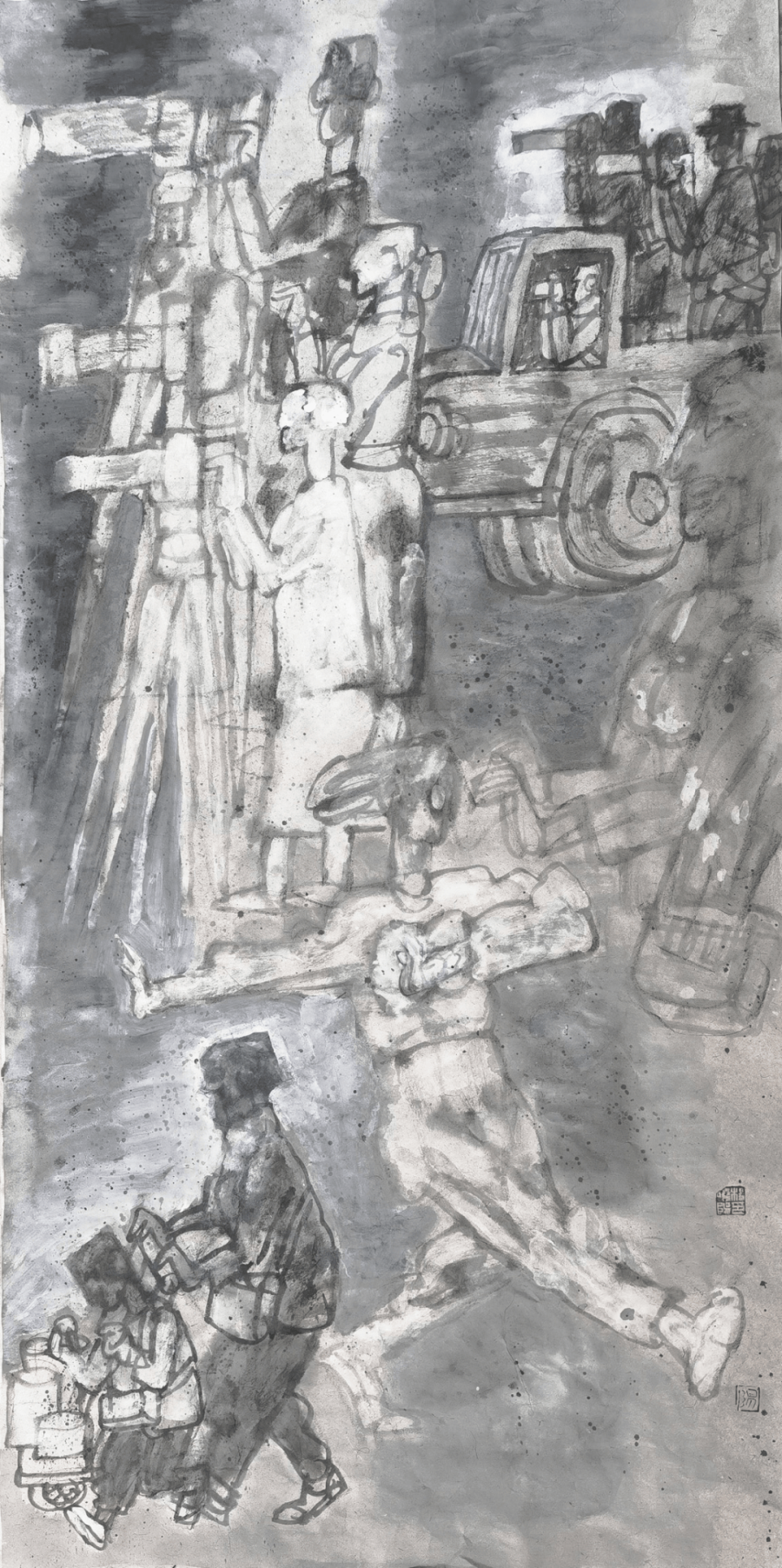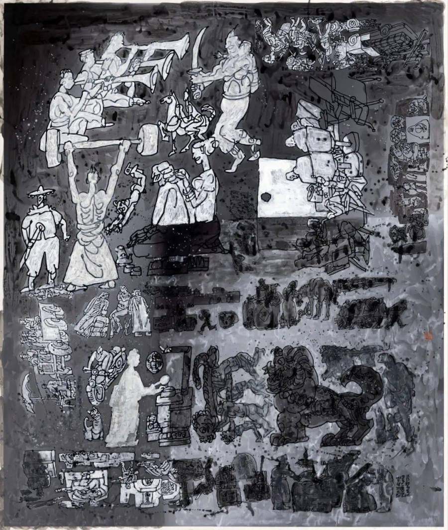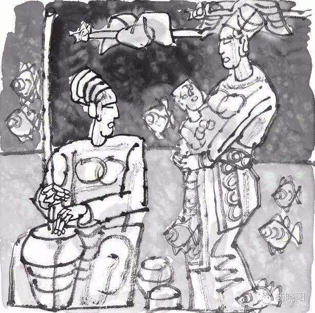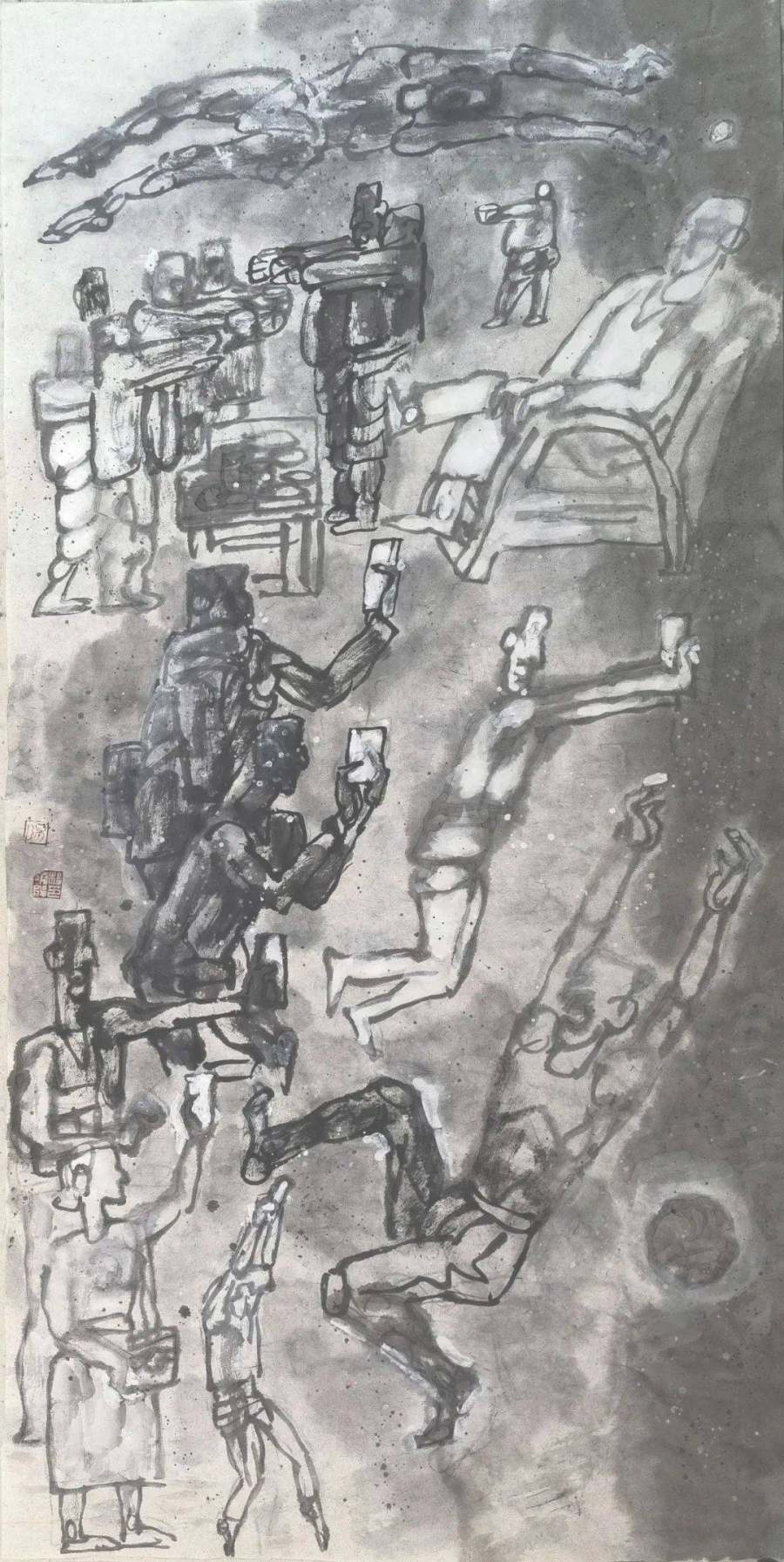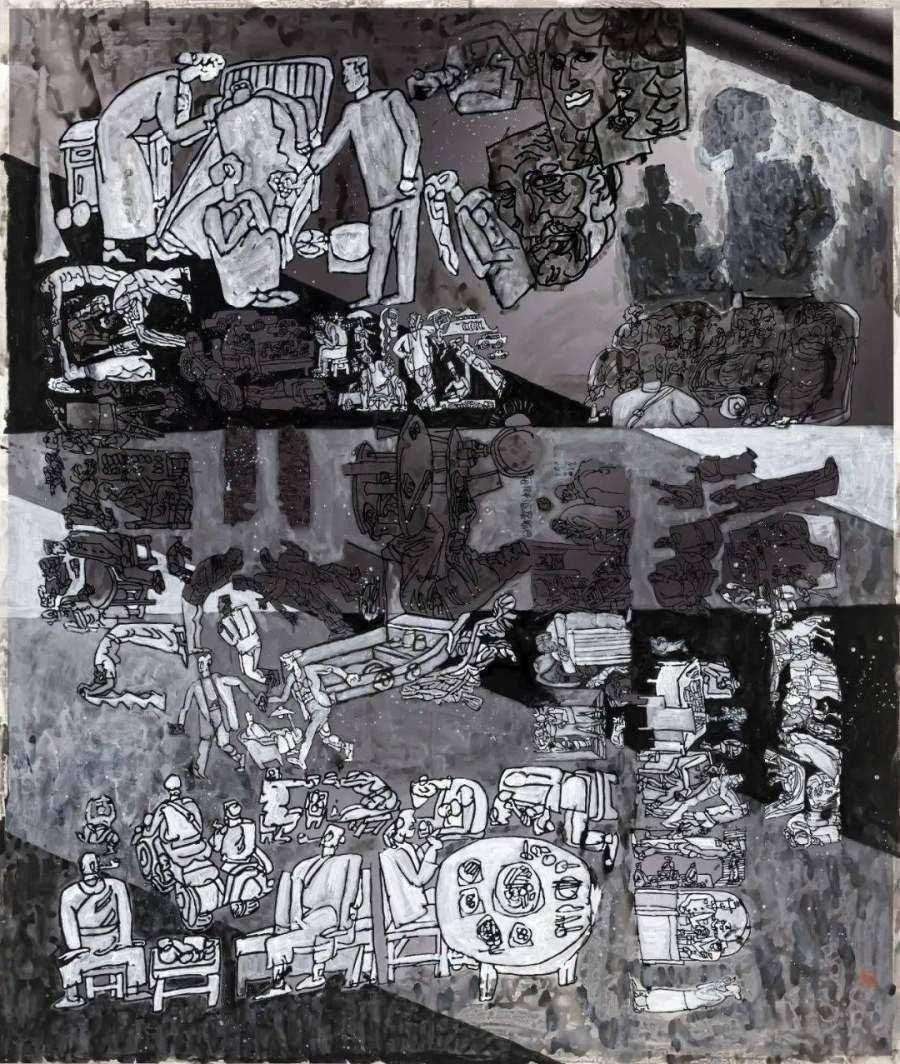 大约从2000年开始,杨晓阳开始着重致力于写意水墨画的探索和研究。他的大量速写为其水墨画实践奠定了风格上的基础。尤其是他近些年在造型上日趋简洁、概括,甚至呈现出几何化、程式化趋向,这对于艺术家来说,是一个从复杂、绚烂走向简括、平淡的过程,也是一个艺术家成熟的标志。也正因此,他的水墨画不仅在造型上进行了大跨度的变形,而且在构图上具有了平面构成的意味。这种表达方式看似吸收了现代艺术的因素,实际上是对中国传统造型方式的现代演化,其中包含了青铜器、汉画像石和诸如西北栓马桩这样的民间艺术等方面。更让我们注意的是,在依照中国传统造型法则吸收现代艺术形式语言的同时,他的水墨画仍然遵循了传统中国画以书入画的原则,将书法用笔揉入线条之中,使之画面更具变化和韵味。特别是他的石鼓和魏碑笔法不仅增加了线条的厚重和力度,也与他的古拙的造型相吻合。这些都体现了他题材模糊化、主题多义化、造型意象化、章法多维化、用笔书法化的艺术追求。杨晓阳也因此而在当代水墨艺术家中独树一帜。他清晰的四个段落表现出一种不断超越自己的艺术家的轨迹,给我们以深刻的启示。