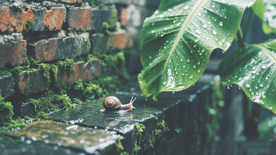 它先停了会儿,再慢慢拖出道银痕——初时像撒了碎盐,爬过几厘米便随砖纹弯转,遇着凸起的棱,也不断,跟着拐个小弯再向上。墙根妇人拎着菜篮快步过,鞋跟敲得石板嗒嗒响,她走远了,蜗牛才挪了指甲盖宽。砖面小石子拦路,它触角一碰便绕开,银痕也跟着画了道细亮的边;偶有芭蕉水珠溅在壳上,它猛缩身子藏进壳里,片刻后才探出头,触角先碰砖、再碰银痕,确定安全便贴着砖面爬,把断了的银痕慢慢补续,像缝起一截碎银链。