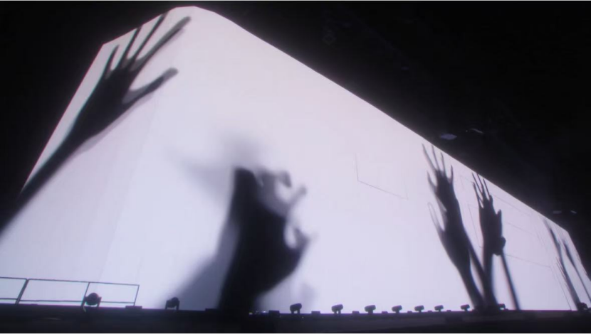 舞台装置则是情绪叙事的延伸,舞台本身被设计成暗藏玄机的“礼物盒”——1800平米平整巨幕大屏里藏着伸缩机关,行业首创的三折叠百叶机械屏不仅供大型道具进出,还呈现一种机械巨兽的质感,两侧也特别设计了弧形转角大屏满足侧面观众的观演需求。