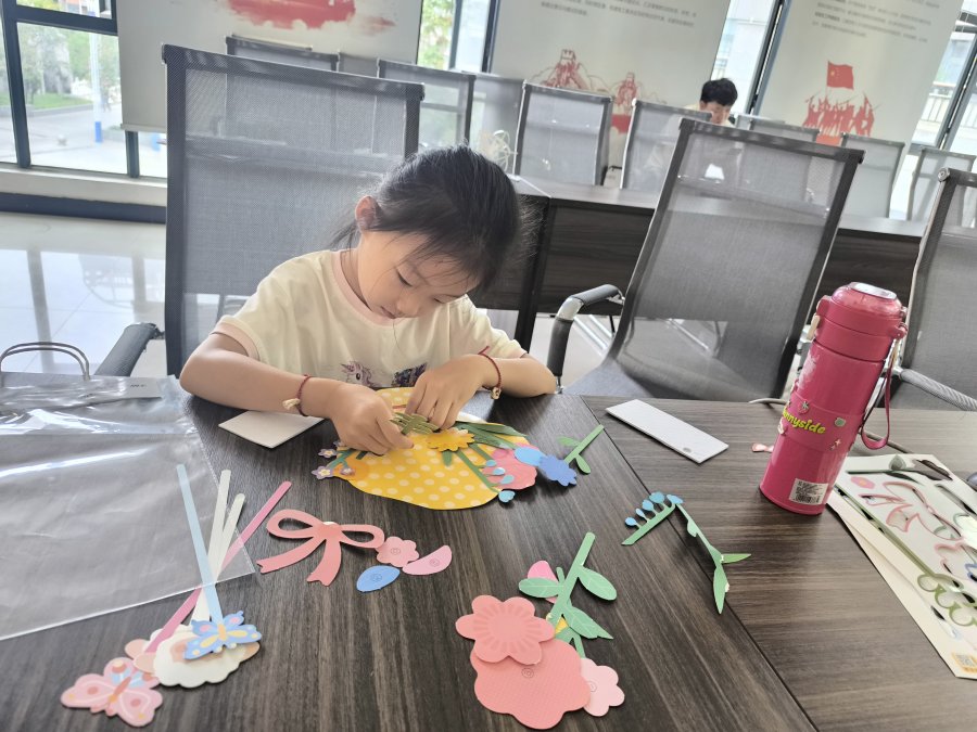 活动当天,社区活动室温馨而热闹。长桌上整齐摆放着五颜六色的手工材料包——鲜艳的彩纸、柔软的丝带、小巧的剪刀、清香的干花装饰……郑州银行的志愿者和社区工作人员早早来到现场,细致地为每一组家庭讲解立体花的制作技巧,并耐心示范剪裁、折叠、粘贴等步骤。孩子们听得认真,家长们不时在旁指导,亲子间的互动格外暖心。