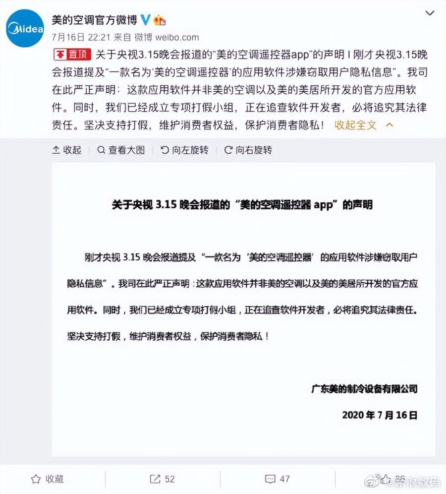 “趣解商业”注意到,2020年央视3.15晚会期间,提及“一款名为‘美的空调遥控器’的应用软件涉嫌窃取用户隐私信息”。