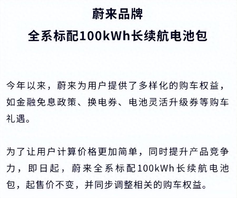 蔚来汽车(HK:09866、US:NIO,下同“蔚来”)发布公告称,为了让用户计算价格更简单,同时提升产品竞争力,自8月29日起蔚来品牌全系标配100kWh长续航电池包,且起售价维持原75kWh版本价格不变,并同步调整相关的购车权益。