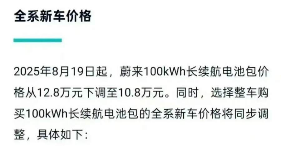 而就在本次公告发布的十天前,蔚来汽车才宣布品牌100kWh长续航电池包价格从原来的12.8万元下调2万元至10.8万元;同时对电池升级服务进行了调整,永久升级服务定价由5.8万元下调至3.8万元。