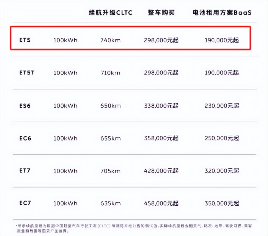 值得注意的是,如果用户采用电池租用方案(BaaS),购车门槛还将进一步降低,在享受续航里程由560km增配至740km的情况下,ET5的起售价首次跌破20万元门槛,低至19万元起。