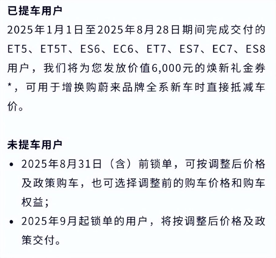针对2025年1月1日至8月28日期间完成交付的ET5、ET5T、ES6、EC6、ET7、ES7、EC7和ES8老用户,蔚来汽车给予了一定补偿,承诺将为其发放价值6000元的焕新礼金券,可用于增换购蔚来品牌全系新车时直接抵减车价。