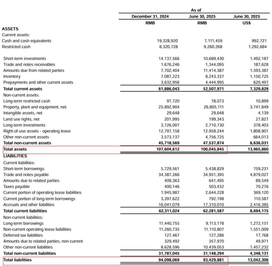 更为现实的是,蔚来汽车的长期亏损已对其财务指标产生了多方面影响。该公司的总资产由2024年末的1076.05亿元降至2025年6月末的1000.46亿元,总负债却依旧高达934.30亿元,高达93.39%的资产负债率拷问着其长期债偿能力。