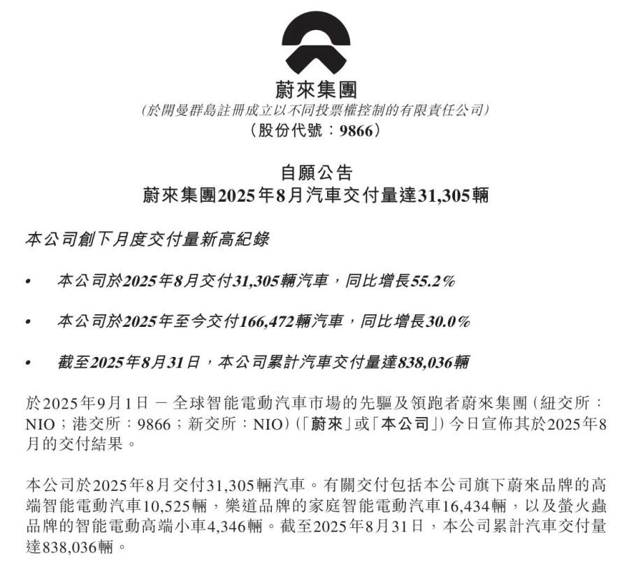 不仅如此,蔚来汽车的核心品牌“蔚来”还面临着销售增长瓶颈。根据该公司最新发布的汽车交付量报告,2025年8月蔚来汽车共计交付新车31305辆,同比增长55.2%,且较7月的21017辆有了显著提升。