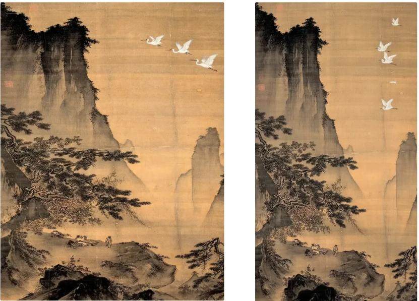 这回主要考验AI能不能在中国风古画上加戏,模型不仅要画出“白鹭”,更重要的是要让这些白鹭完美融入古画的意境中,无论是笔触、墨色还是构图,都不能有违和感。