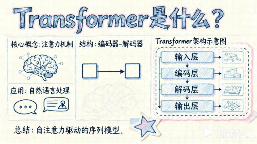 Nano Banana在趣味性上稍逊一筹。但其优势在于对复杂元素的组织能力,在介绍Transformer的页面中,它运用了更多样、更复杂的图形元素来构建画面,视觉层次更丰富。