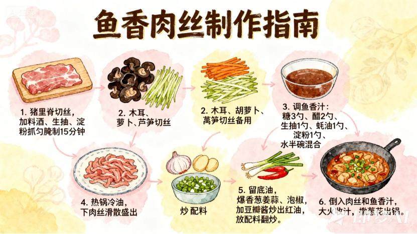 尤其是下面的鱼香肉丝制作指南,看得出来对细节的把控很到位,整体所有食材的手绘图细节都还不错。