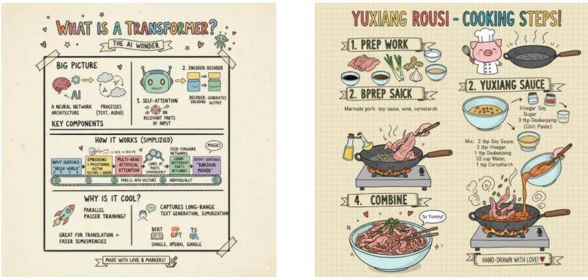 即梦4.0的表现很不错。生成的中文文字清晰准确,几乎没有错误。无论是解释Transformer架构的图文排版,还是鱼香肉丝的食材图鉴,都细节满满,风格统一,实用性与美观度兼备。