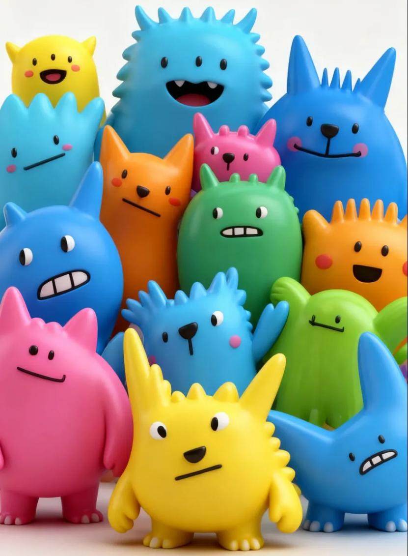 即梦4.0本身自带强烈的模型和手办质感,非常适合这个主题。它能生成下面这样类似“泡泡玛特”风格的潮玩或精致的游戏模型,色彩鲜艳,造型可爱且富有设计感,主要是一致性很好。
