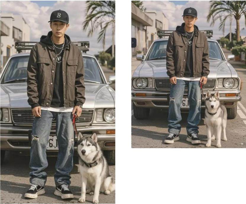这一轮,两个模型都展现了成熟的图像编辑能力,无论是写实的哈士奇毛发,还是与环境的融合度,都处理得非常好,效果难分伯仲。