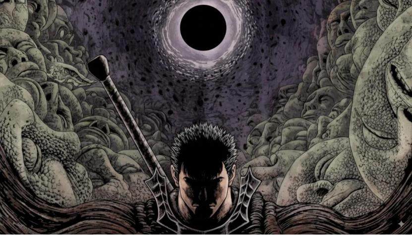 下面这个案例会更复杂些。非常考验模型的上色能力和对特定艺术风格的理解。不仅仅是填色,好的AI上色需要理解,漫画作者三浦建太郎原画中的光影、材质和氛围,用色彩来增强而非破坏原作的厚重感和力量感。