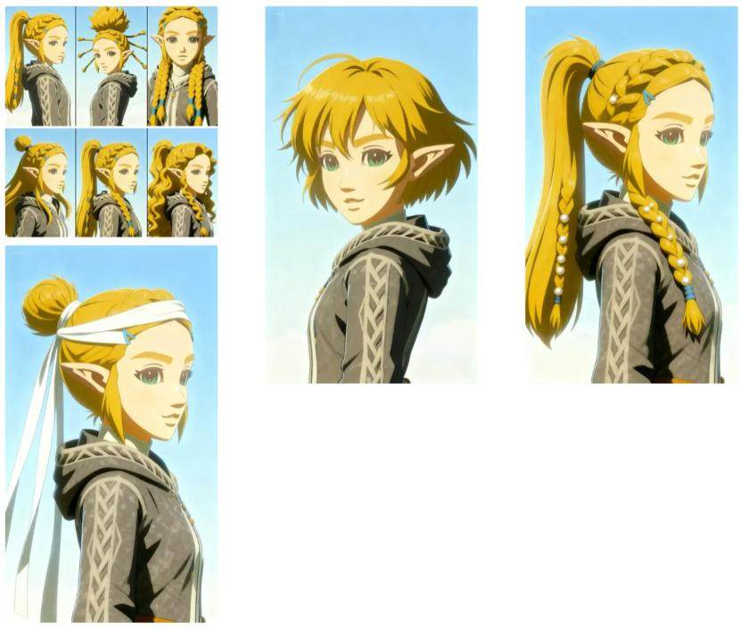 Nano Banana表现更为稳定。它严格地保留了原图的背景和人物姿态,仅针对发型进行多样化设计,更忠实于提示词和原有画风,最终结果的风格一致性很强。