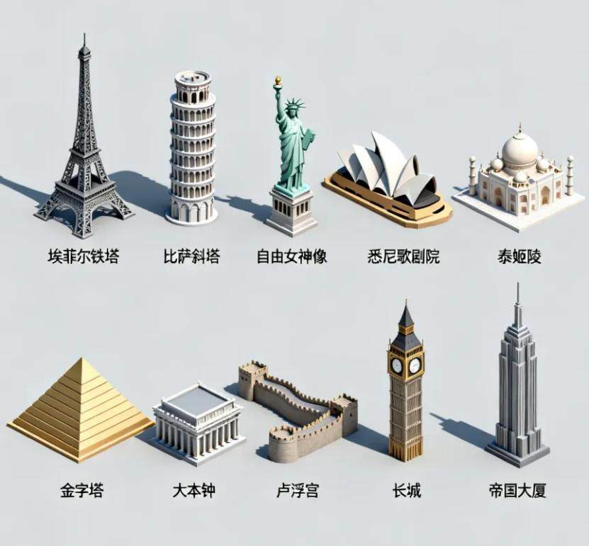 Emmmm怎么说呢,左侧是即梦4.0,以一种非常“直白”的方式完成了任务,它将10个地标建筑分别生成为独立的等轴模型,并严谨地配上了文字标签,像是一份建筑图鉴。