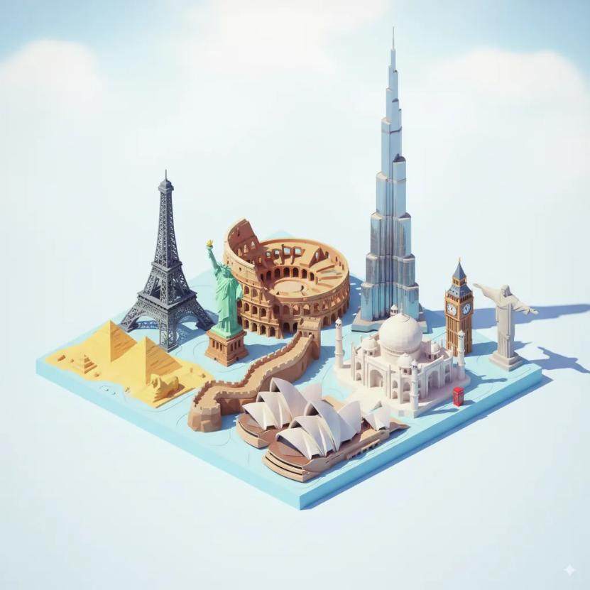 Nano Banana则将所有地标建筑融合在一张大图里,创造了一个微缩景观世界,整体更像是一个精美的模拟经营游戏资产。