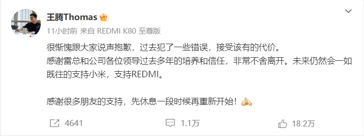 随后,王腾也发文回应了此事,“很惭愧跟大家说声抱歉,过去犯了一些错误,接受该有的代价。感谢雷总和公司各位领导过去多年的培养和信任,非常不舍离开。未来仍然会一如既往的支持小米,支持REDMI。先休息一段时候再重新开始!”