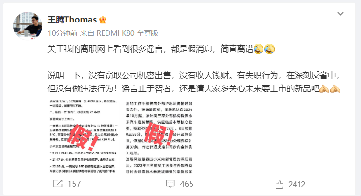 截至9月9日上午十点,王腾对网传被辞退的原因进行了辟谣,“没有窃取公司机密出售,没有收人钱财。有失职行为,在深刻反省中,但没有做违法行为!谣言止于智者,还是请大家多关心未来要上市的新品吧。”