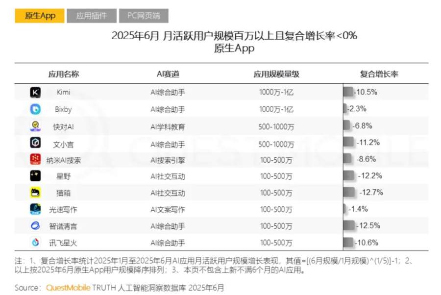 但纳米AI搜索的增长速度,没有匹配上“网红”周鸿祎带来的热度。QuestMobile数据显示,2025年6月,纳米AI搜索的应用月活规模量级仅有100~500万,且复合增长率为-8.6%,对比同期Kimi应用1000万~1亿的月活,差了近10倍。