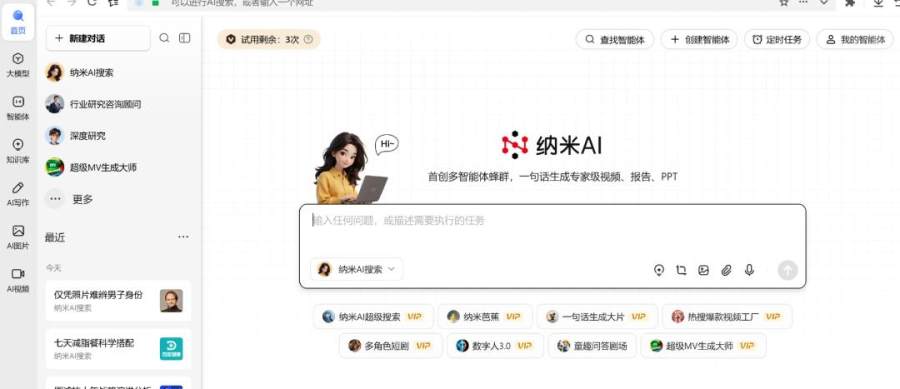 打开纳米AI搜索,可以看到,它的首页还是AI搜索功能,又在侧边栏置入了一系列AI功能,包括今年爆火的智能体、大模型广场、文生图/视频、知识库等。