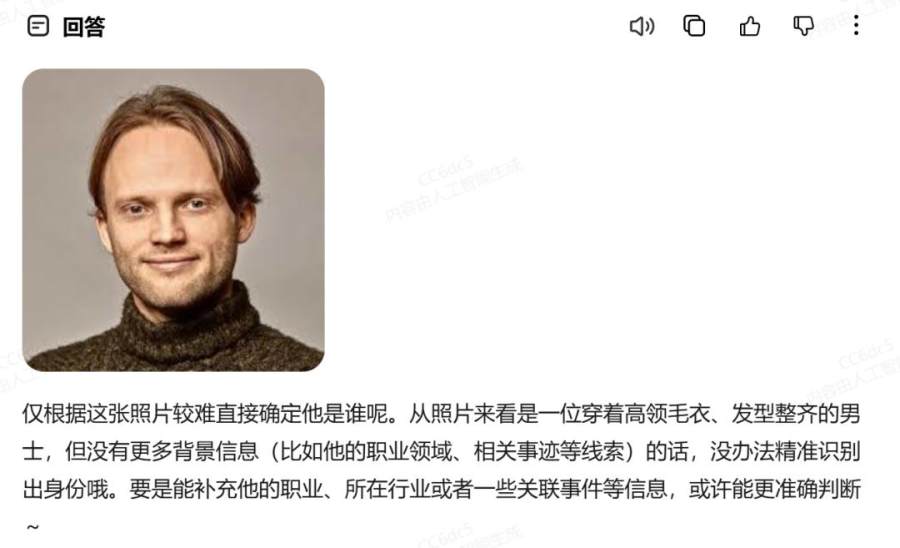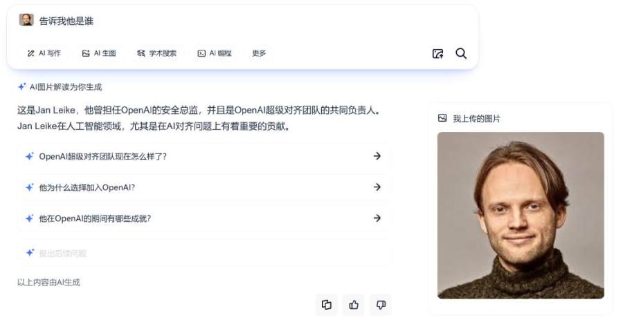 在周鸿祎曾经强调优势的多模态搜索上,纳米AI搜索的表现也不太理想。光锥智能拿前OpenAI超级对齐团队负责人Jan Leike的照片分别询问纳米AI搜索和夸克,前者无法辨别,而后者给出了正确的答案。
