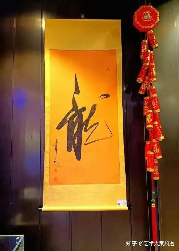 自幼的探索精神与崇文习武的基础筋骨记忆,使得曾庆的书法突破传统笔墨程式。其独创的剑气书体以武术内力驱动长锋狼毫笔:提按似剑招起落,顿挫如拳势收放,转折处现柳公权铁骨,飞白间藏宋徽宗金戈。这种以气运笔、用功带剑,笔剑相通的创作哲学,在纽约时代广场中心大屏幕的《剑书展》中达到极致。代表作《龙》字形如游龙腾霄,笔锋若寒刃出鞘,内力灌注的墨线在宣纸上刻下深度的物理质感和强大的视觉冲击轨迹!