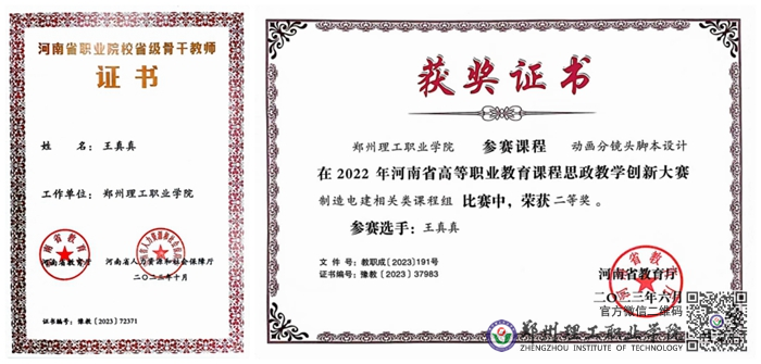 在教学岗位上,王真真始终坚持“育人为本,德育为先”的教育理念,把课堂作为立德树人的主阵地。作为教师,她长期承担了动漫制作技术专业的《动漫剧本和分镜创作》等多门核心课程的教学任务。2024年,她主讲的《动漫剧本和分镜创作》被学校评为优质课程,成为示范性课程建设的重要成果。2022年,她凭借扎实的教学能力,在河南省高等职业教育课程思政教学创新大赛中荣获二等奖。2022年成为河南省教育厅组织的2021年河南省职业院校省级骨干教师培育对象。2023年被河南省教育厅评定为中级“双师”教师。2023年被学校评为“最美教师”。2023年参与申报的《UI设计》课程由河南省教育厅拟认定为2023年河南省职业教育一流核心课程。