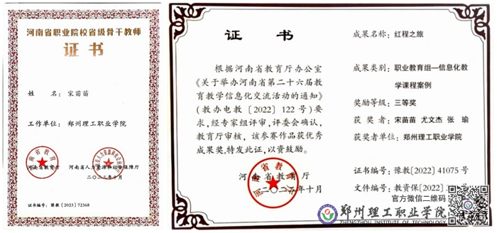 在教学一线岗位上,宋苗苗不断学习新知识新技能,将AIGC人工智能生成技术引入课堂,使学生“学”与“用”零距离对接。她承担《路由器/交换机配置与管理》、《局域网组建技术》等专业核心课程的教学任务,采用项目引领任务驱动的教学方法,深受学生喜爱,教学效果显著,年年教学质量考评均为优秀。2022年所带团队作品《红程之旅》获河南省职业教育组—信息化教学课程案例三等奖,2023年带领团队获得校级教学能力比赛三等奖,2024年《局域网组建技术》课程被学校评为优质课。